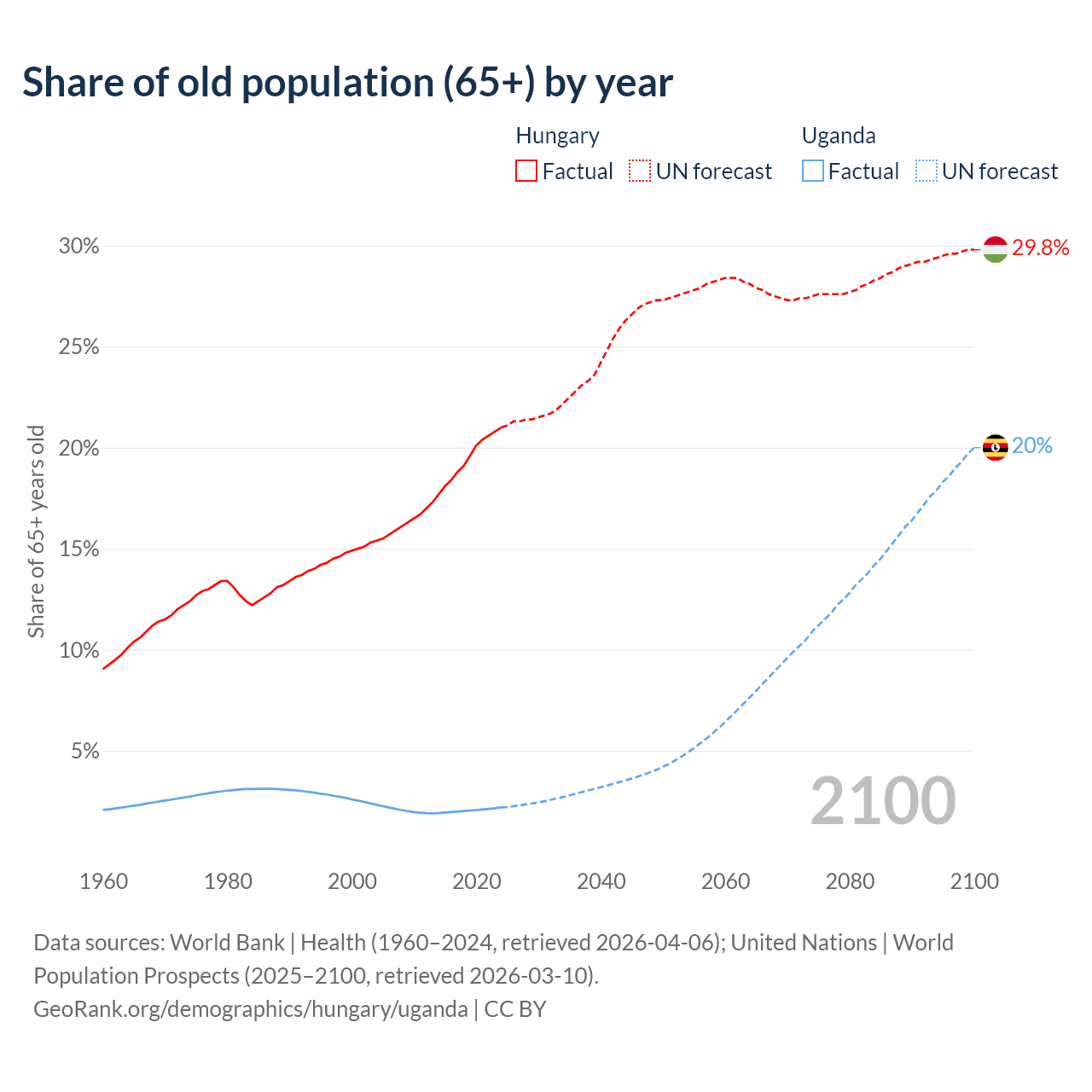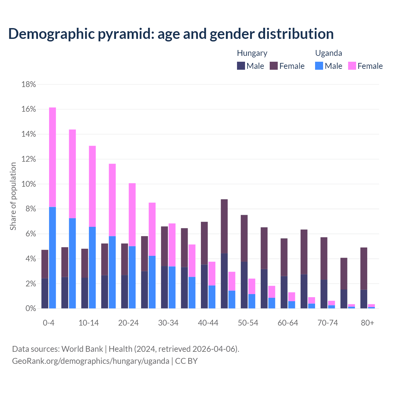 The share of older people aged 65 and over is 21% in Hungary and 2.19% in Uganda. Life expectancy in Hungary compared to Uganda .