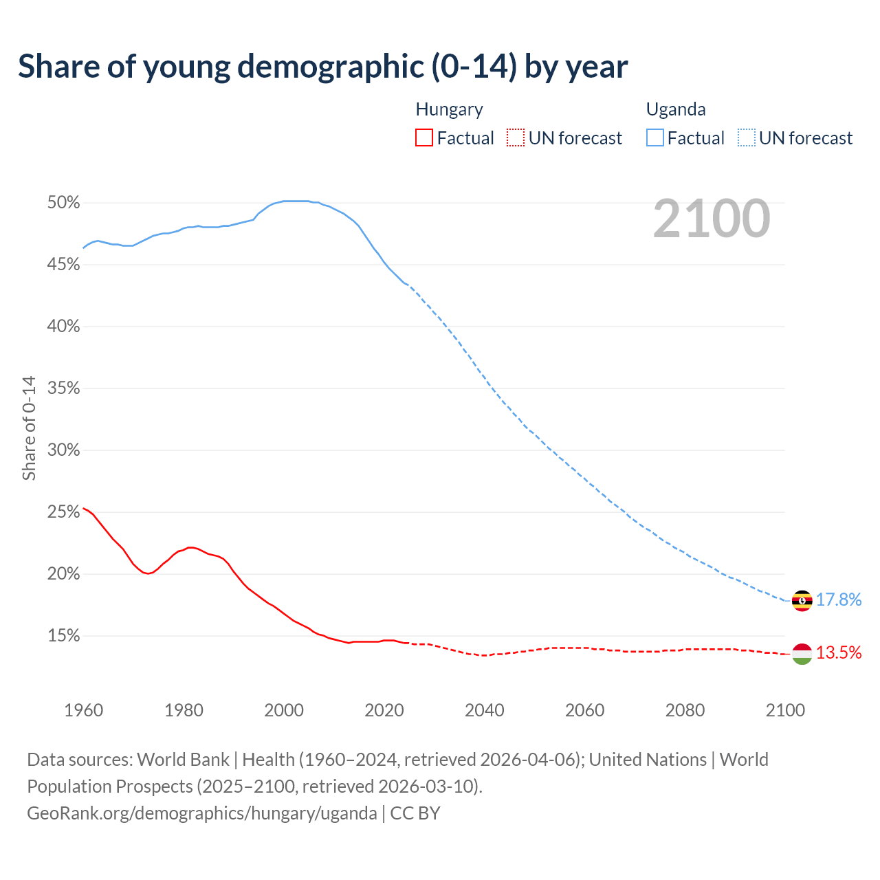 - The share of young demographic (0-15 years old) in Hungary is 14.4% vs 43.5% in Uganda.