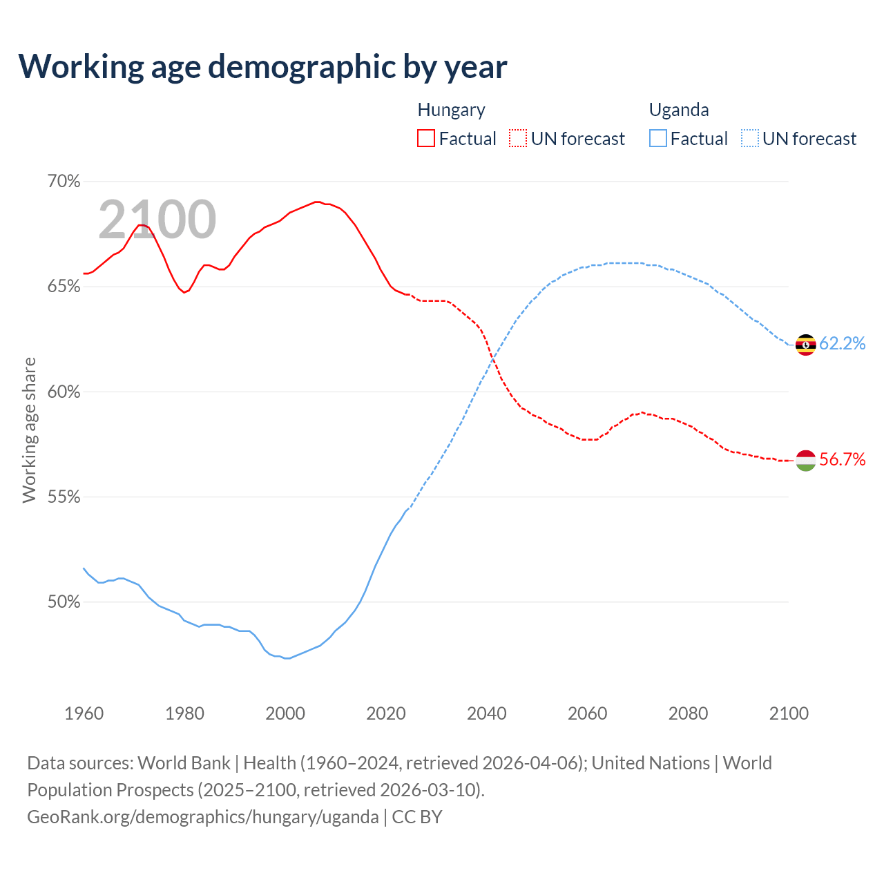 - Hungary has 6.12M working age adults (aged 15-64) vs 28.9M in Uganda.