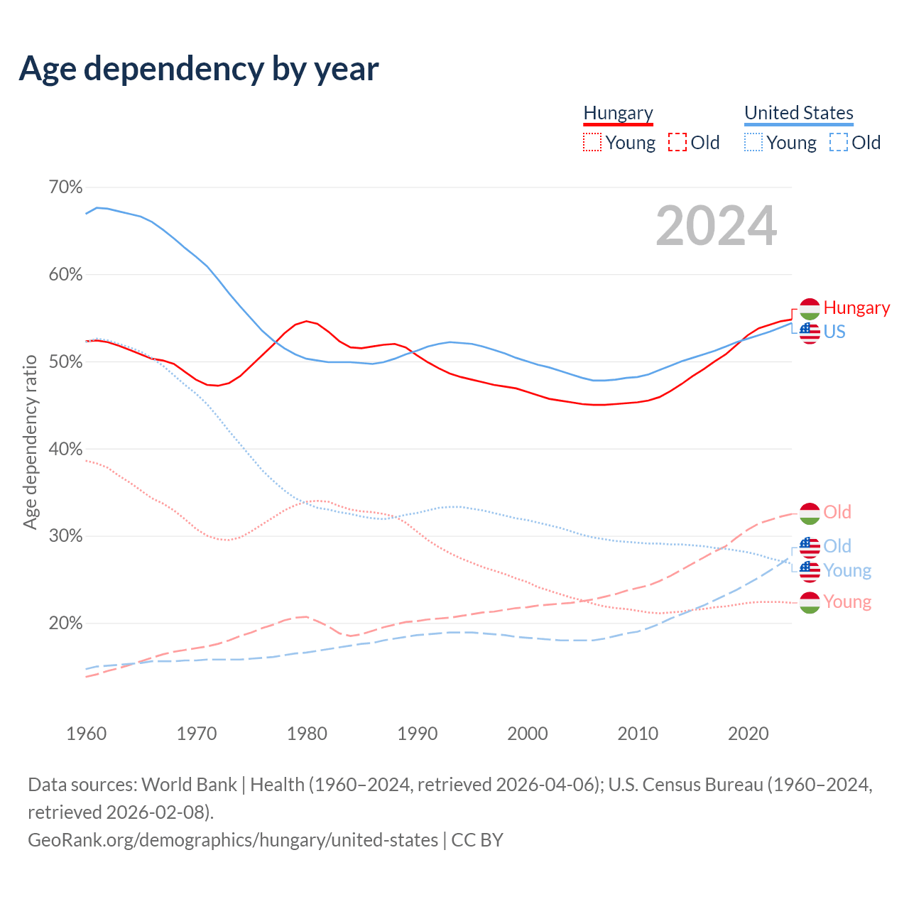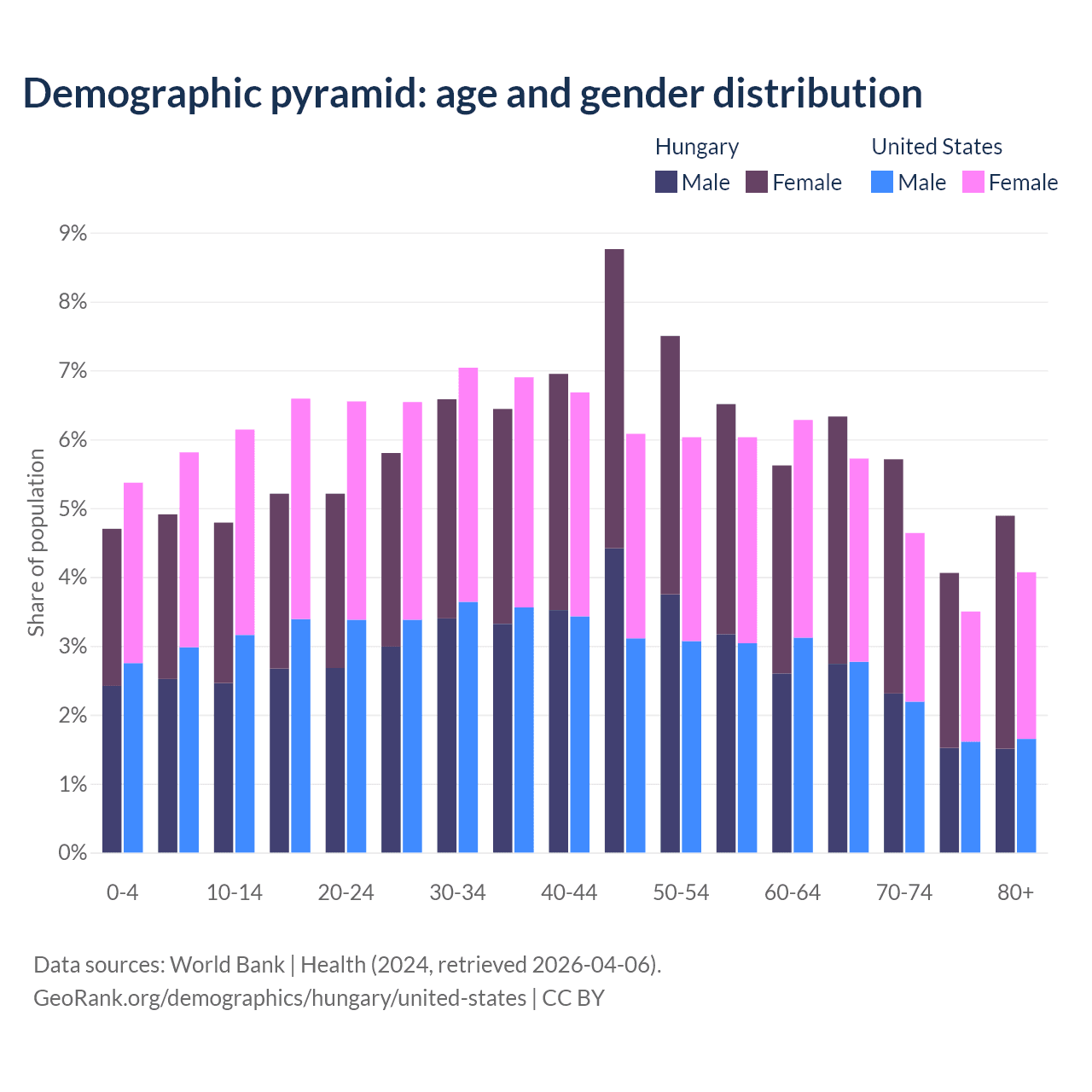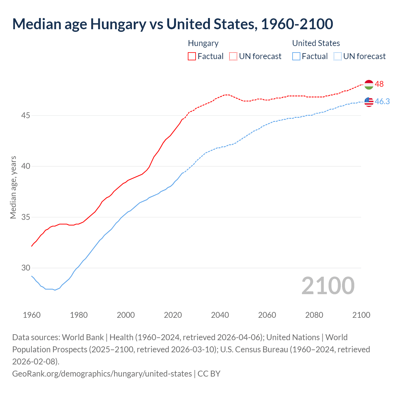 - Hungary is ranked 17/196 by median age (oldest to youngest) vs 50/196 for the United States.