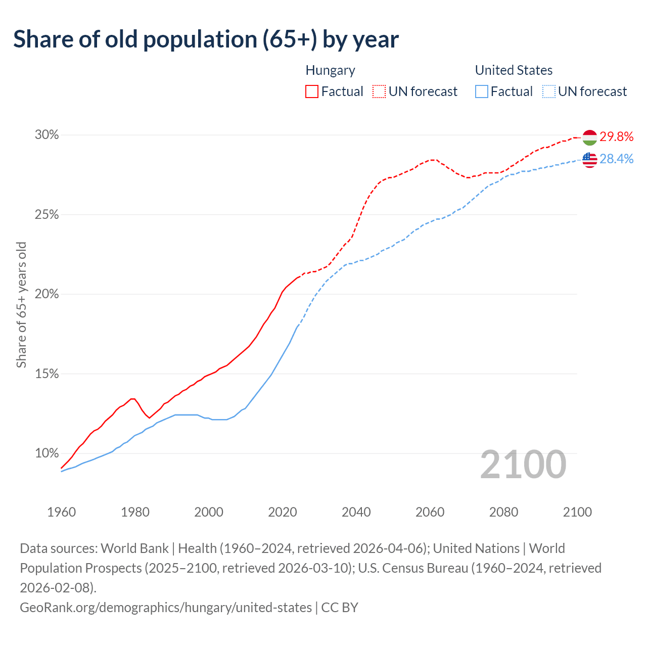 The share of older people aged 65 and over is 21% in Hungary and 17.9% in the United States. Life expectancy in Hungary compared to the United States .