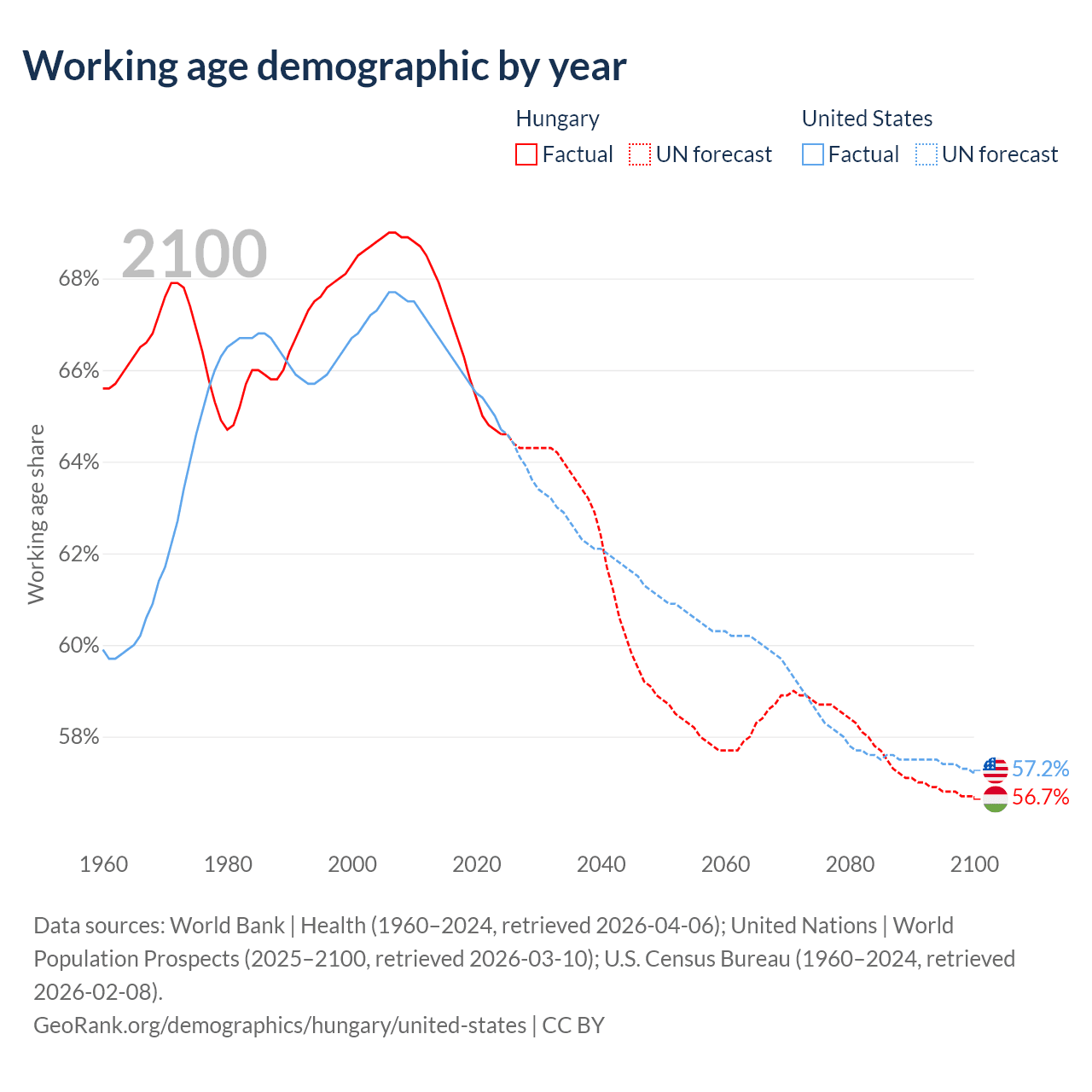 - Hungary has 6.12M working age adults (aged 15-64) vs 223M in the United States.
