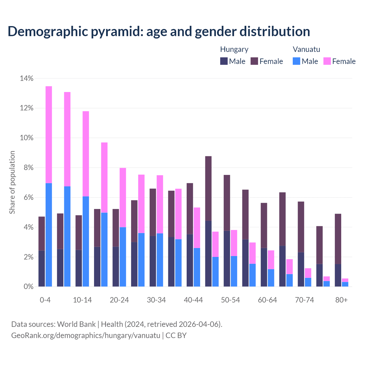 - As of 2026, the population of Hungary is 9.48M vs 345K in Vanuatu - 27.5 times difference.