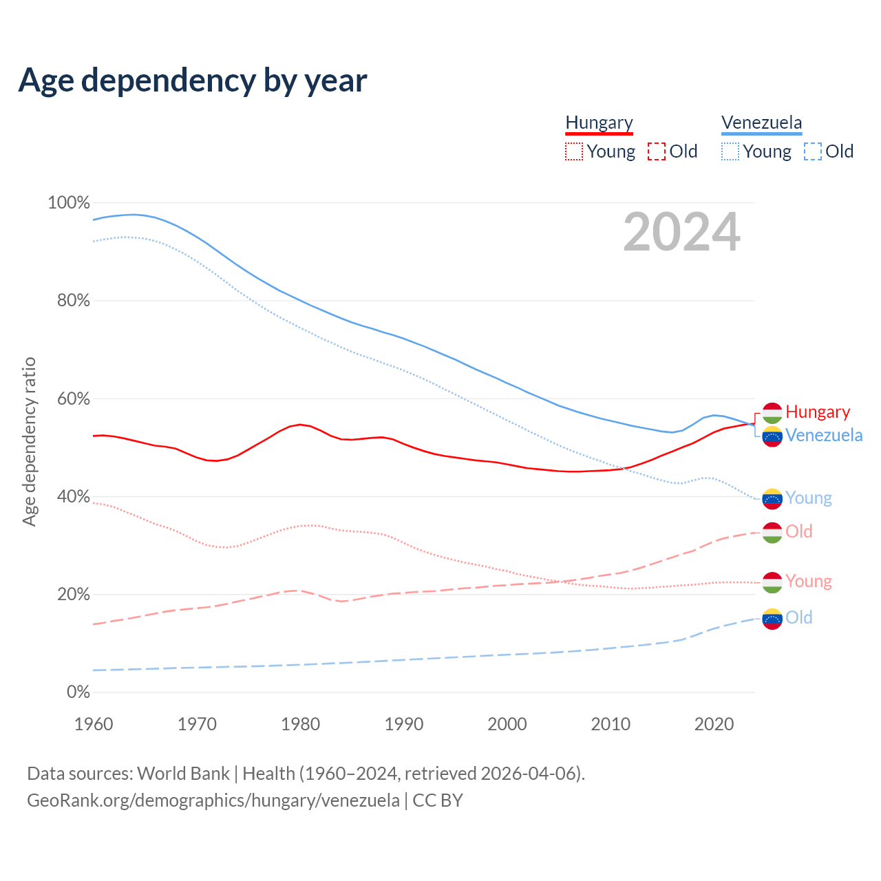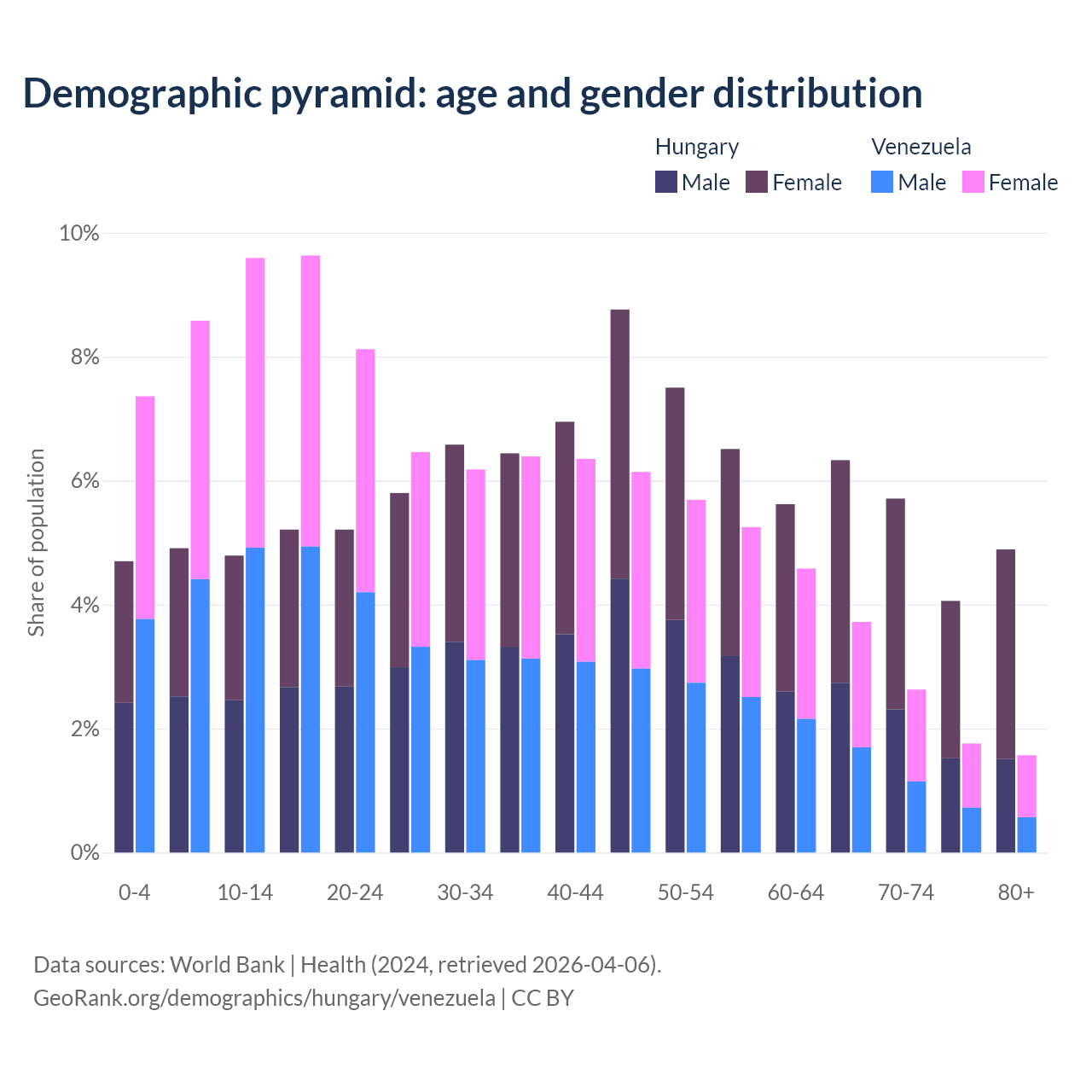 - Hungary is ranked 17/196 by median age (oldest to youngest) vs 104/196 for Venezuela.