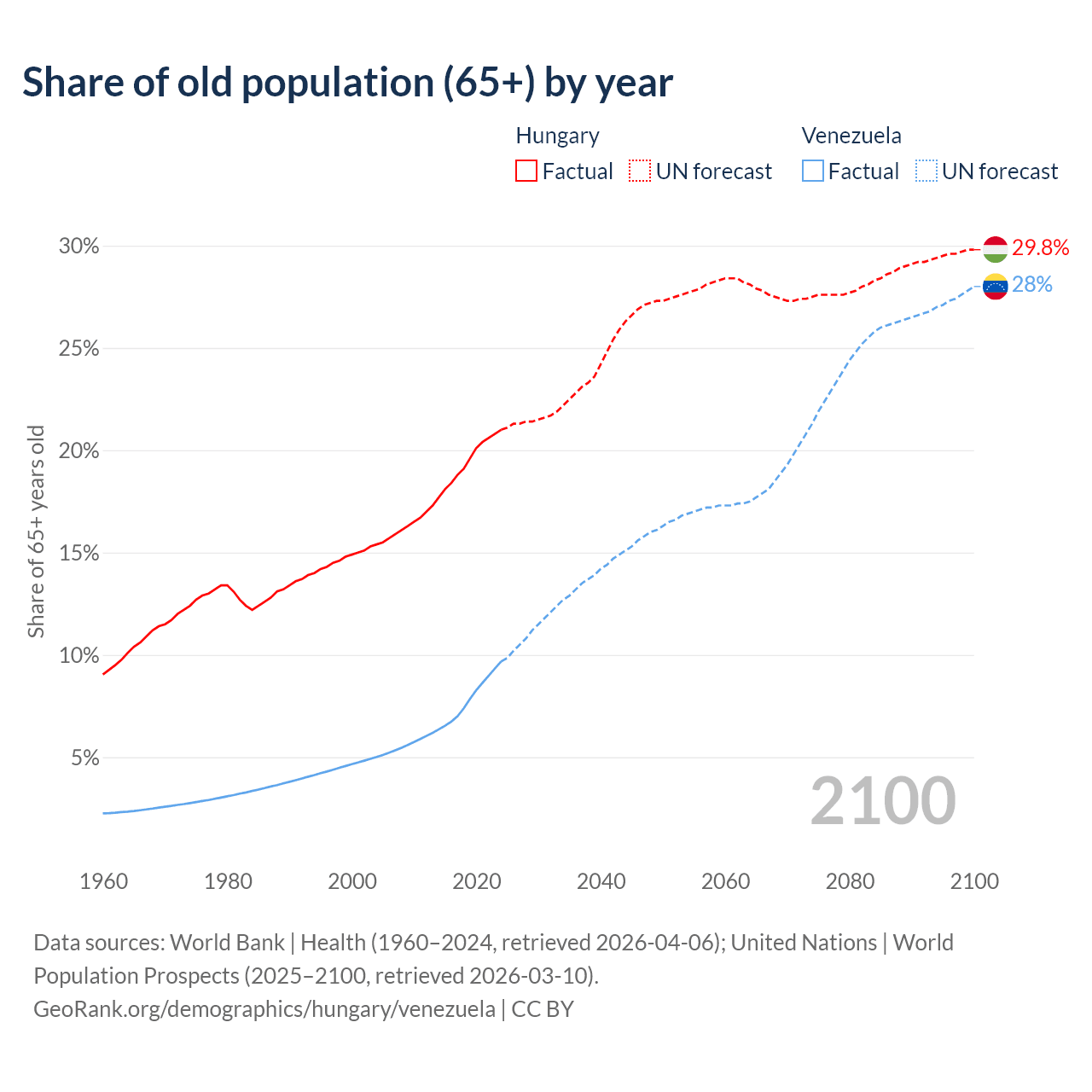 The share of older people aged 65 and over is 21% in Hungary and 9.68% in Venezuela. Life expectancy in Hungary compared to Venezuela .