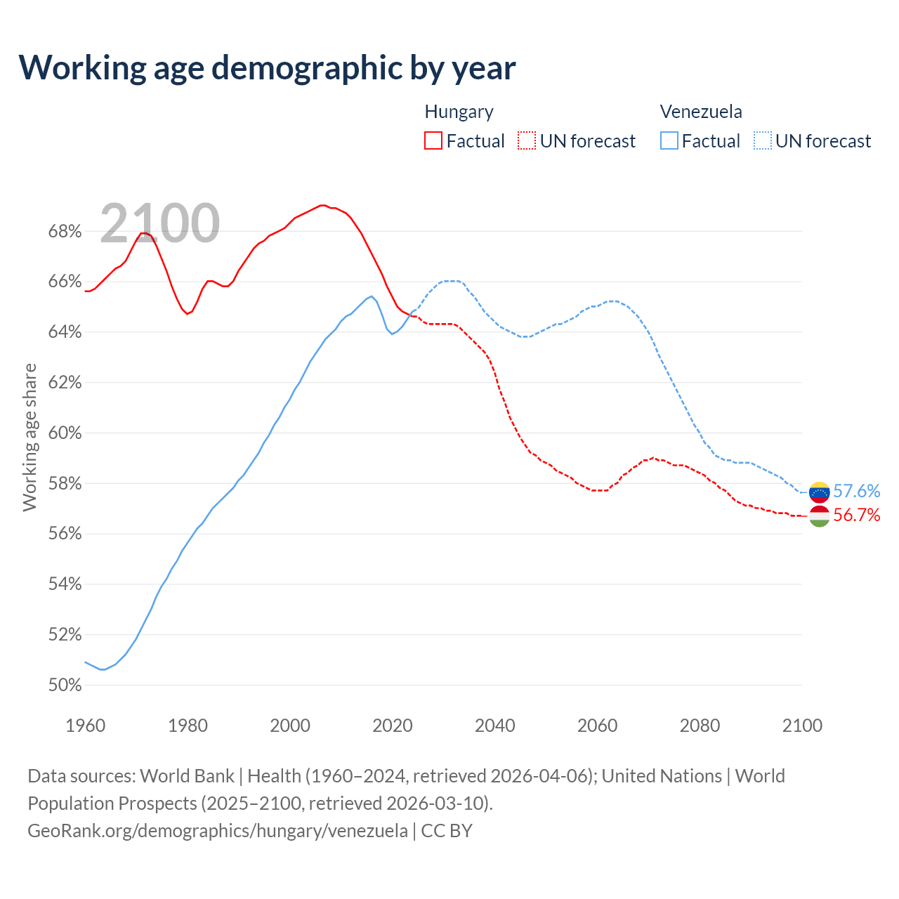 - Hungary has 6.12M working age adults (aged 15-64) vs 18.6M in Venezuela.