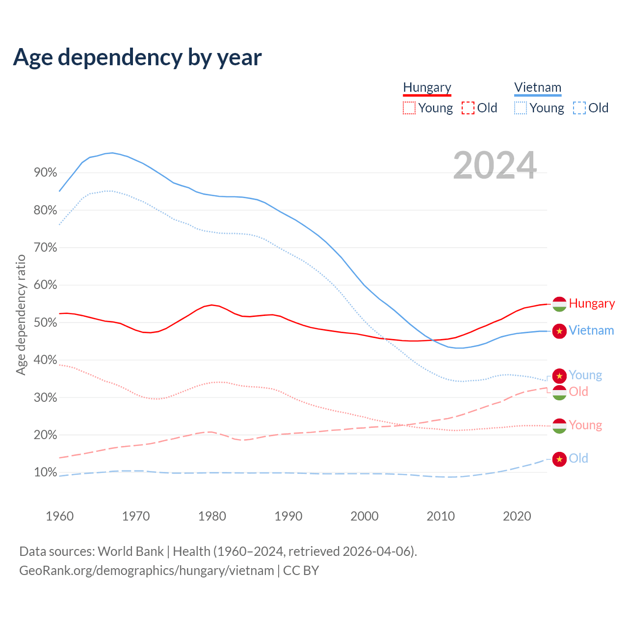 Data sources: World Bank | Health (1960–2024, retrieved 2026-04-06); U.S. Census Bureau (1960–2024, retrieved 2026-02-08).
