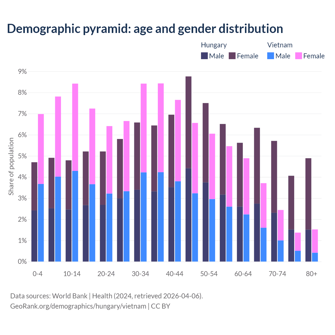 The share of older people aged 65 and over is 21% in Hungary and 9.05% in Vietnam. Life expectancy in Hungary compared to Vietnam .