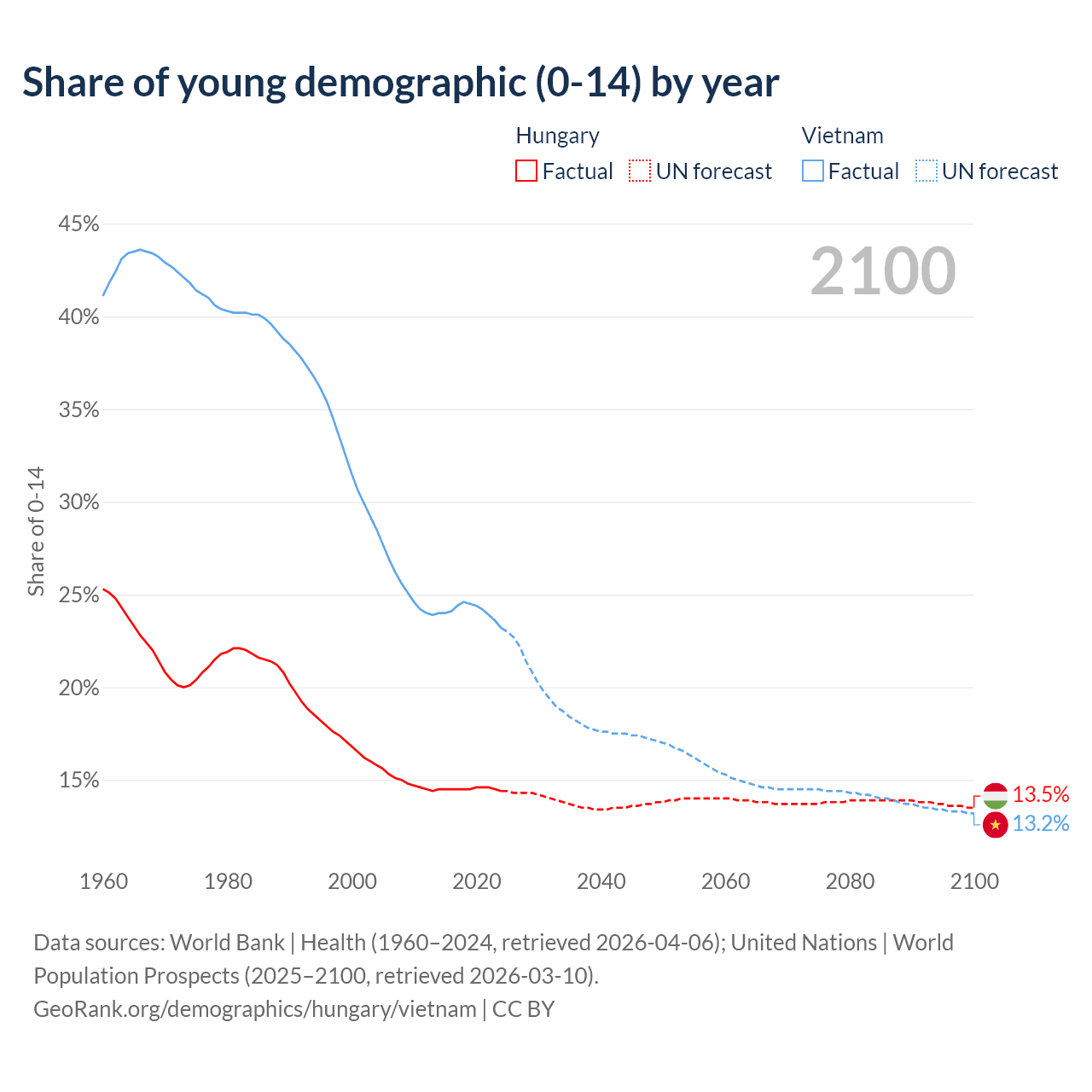 Median age Hungary vs Vietnam, 1960-2100