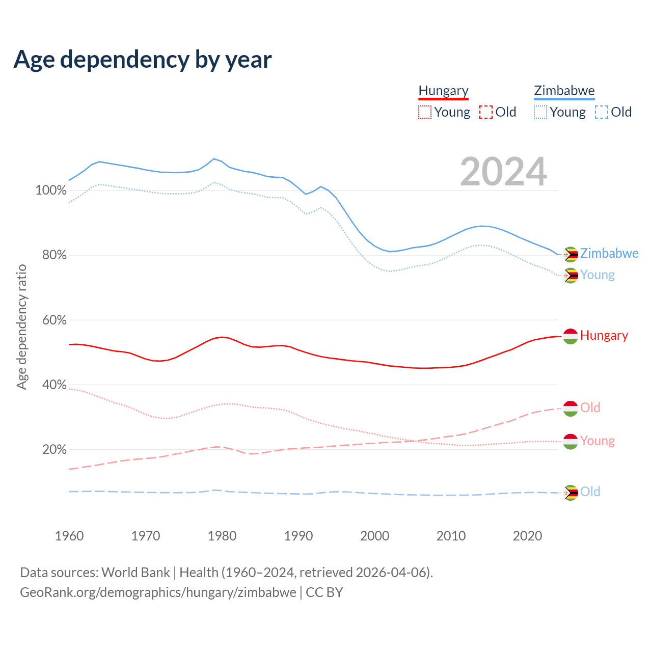 The share of older people aged 65 and over is 21% in Hungary and 3.6% in Zimbabwe. Life expectancy in Hungary compared to Zimbabwe .