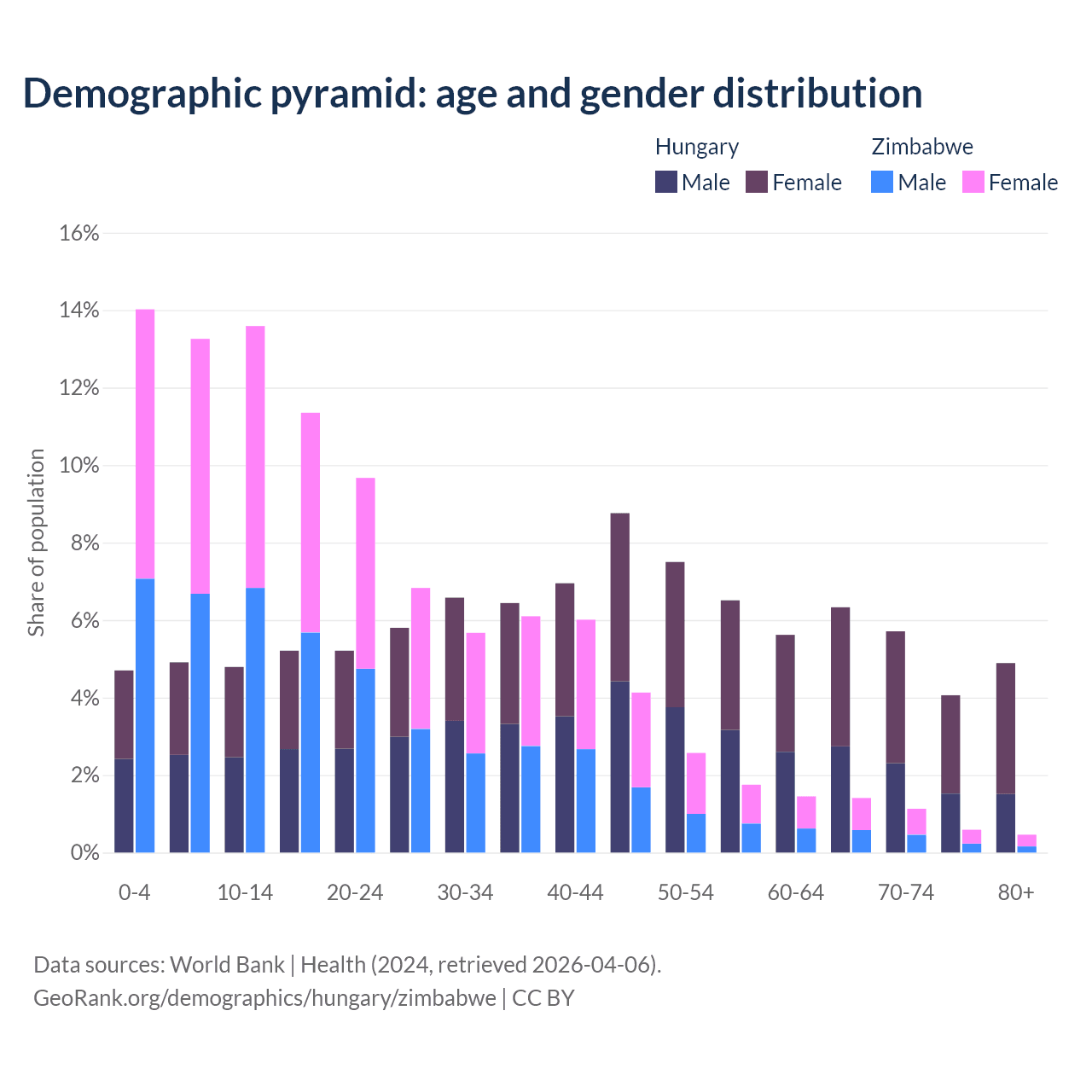 - Hungary is ranked 17/196 by median age (oldest to youngest) vs 177/196 for Zimbabwe.