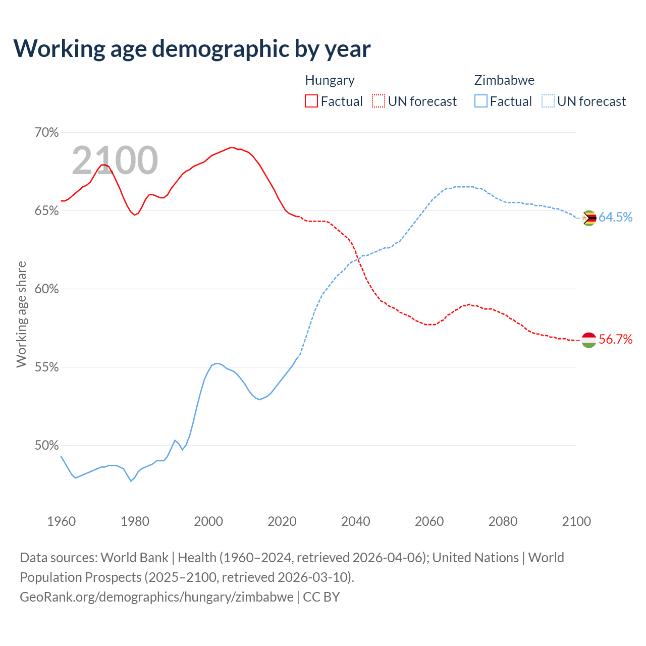 - Hungary has 6.12M working age adults (aged 15-64) vs 9.64M in Zimbabwe.