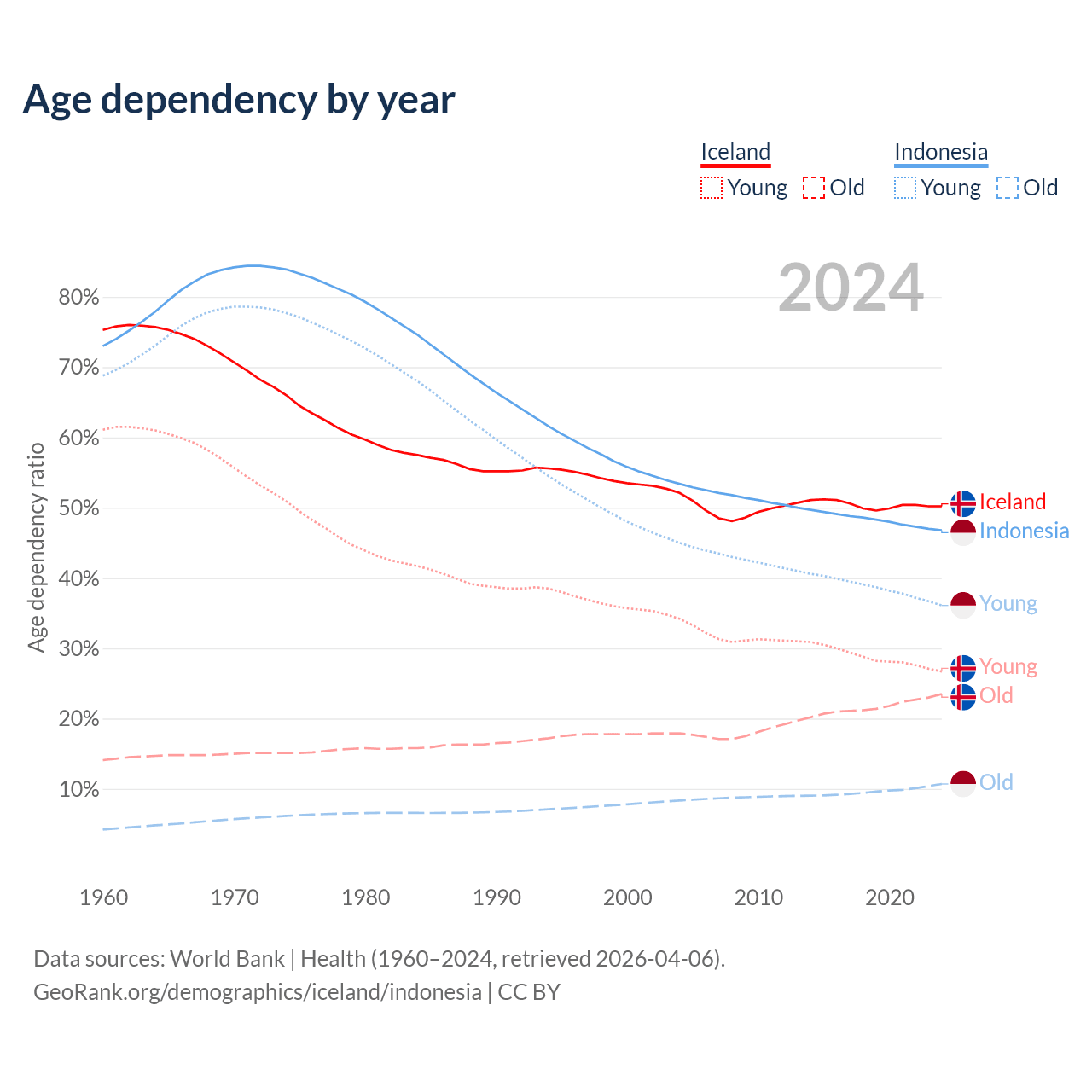 - Iceland is ranked 65/196 by median age (oldest to youngest) vs 93/196 for Indonesia.