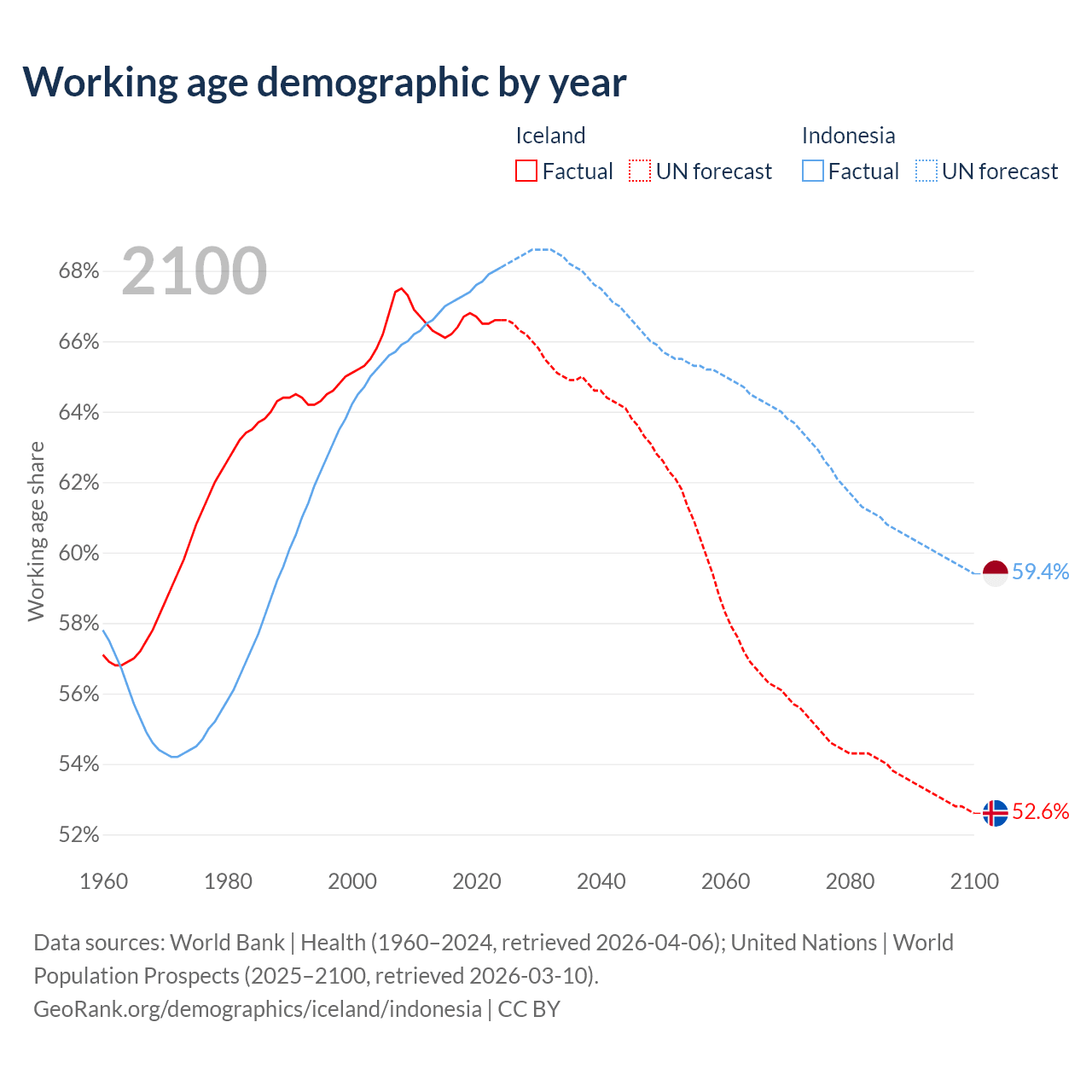 - Iceland has 264K working age adults (aged 15-64) vs 197M in Indonesia.