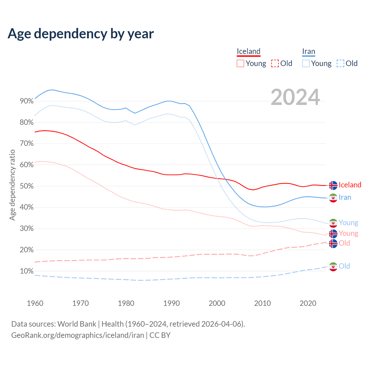 - The share of old-age demographic (65+) in Iceland is 15.6% vs 8.24% in Iran.