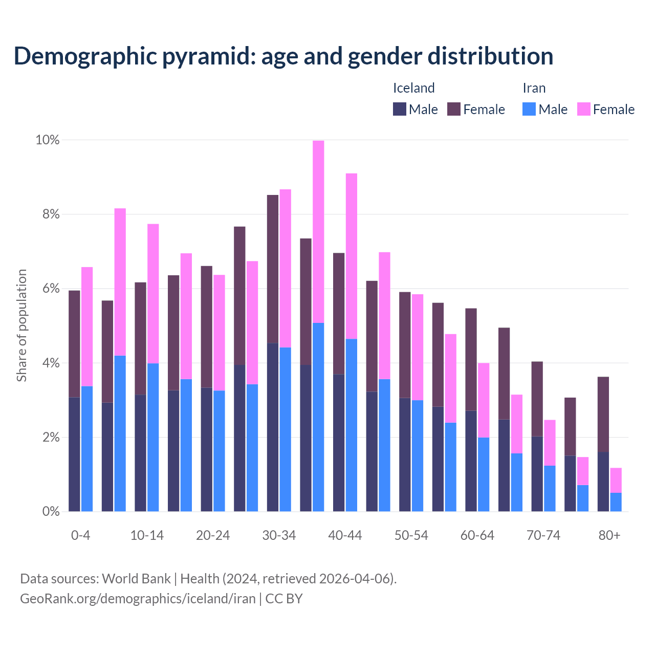 - As of 2026, the population of Iceland is 397K vs 93.5M in Iran - 235.4 times difference.