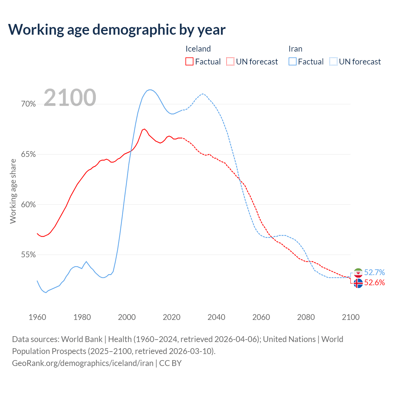 - Iceland has 264K working age adults (aged 15-64) vs 64.8M in Iran.