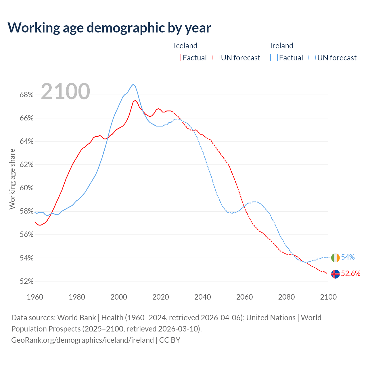 Median age Iceland vs Ireland, 1960-2100