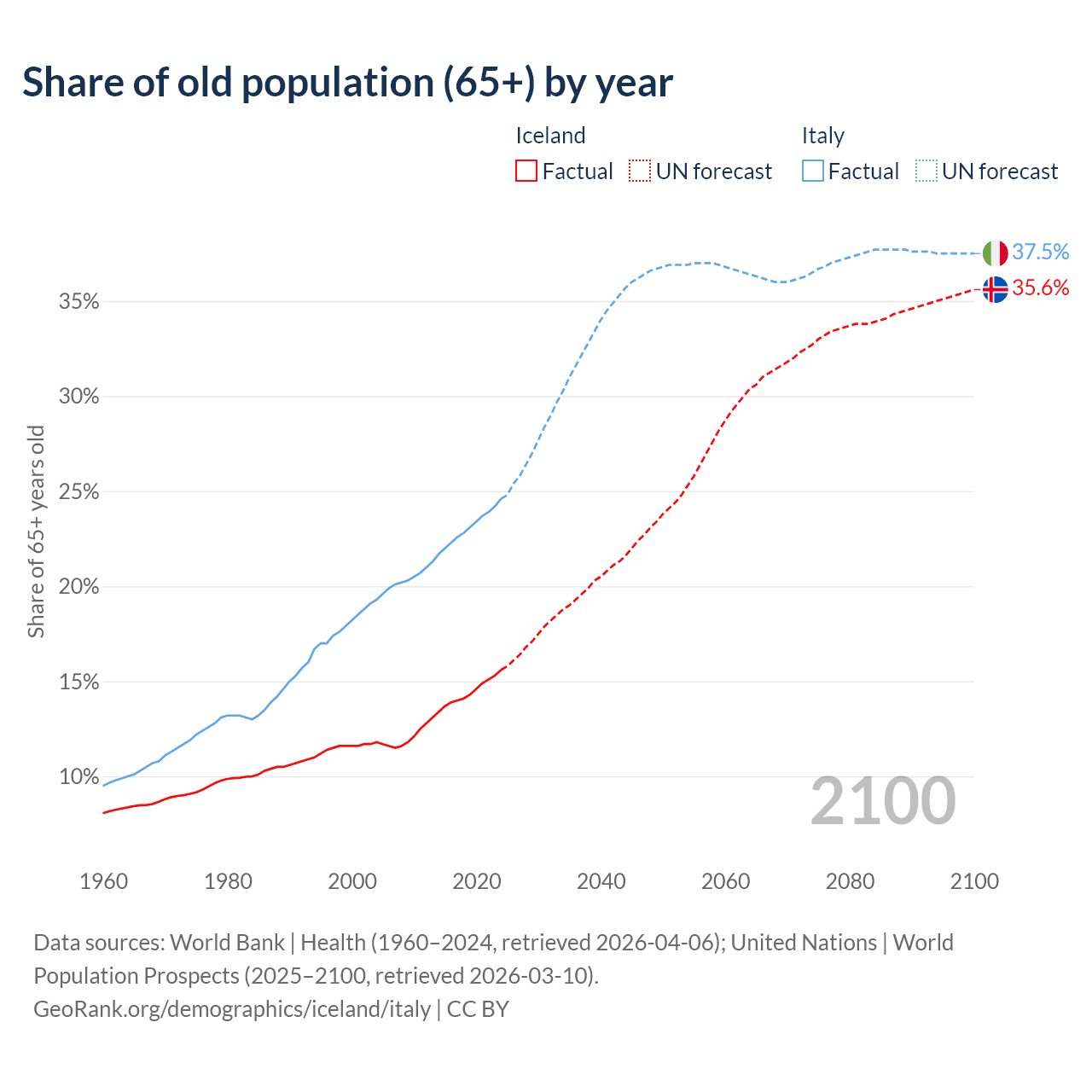 The share of older people aged 65 and over is 15.6% in Iceland and 24.6% in Italy. Life expectancy in Iceland compared to Italy .