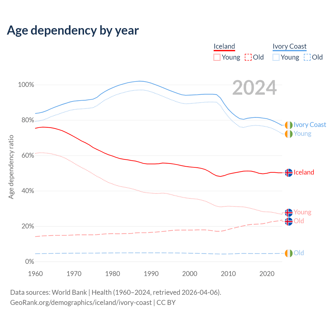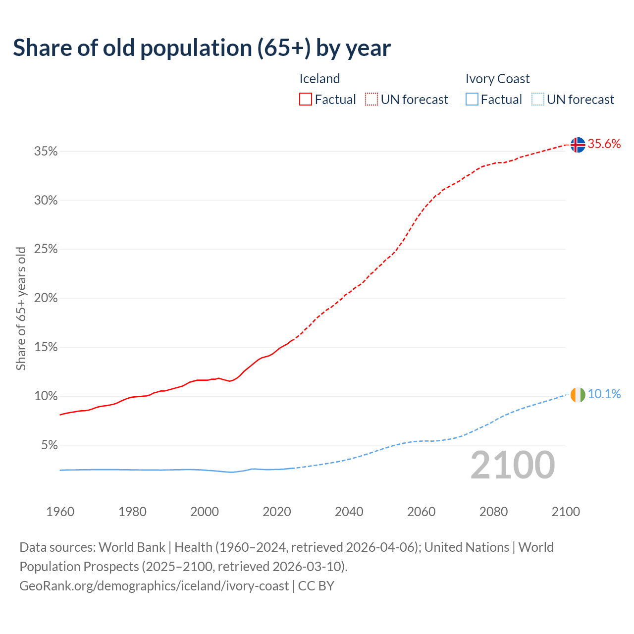 The share of older people aged 65 and over is 15.6% in Iceland and 2.61% in Ivory Coast. Life expectancy in Iceland compared to Ivory Coast .