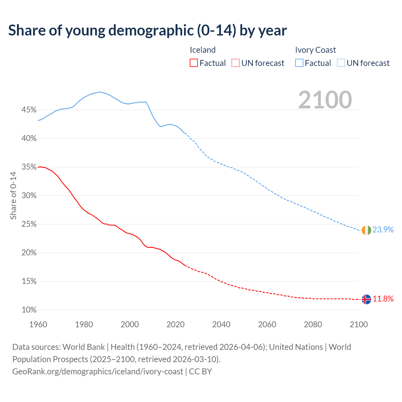 - The share of young demographic (0-15 years old) in Iceland is 17.8% vs 40.9% in Ivory Coast.