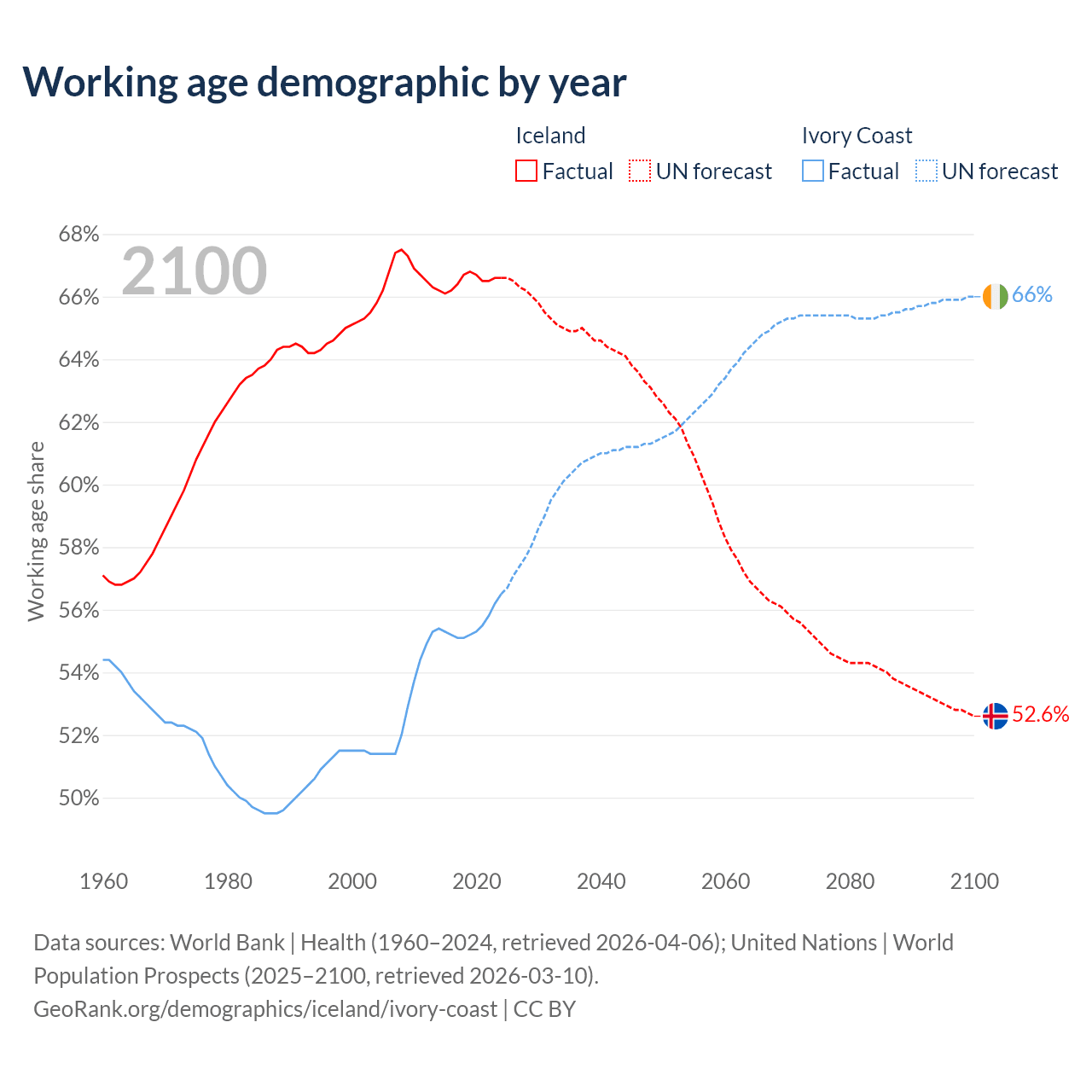 Median age Iceland vs Ivory Coast, 1960-2100