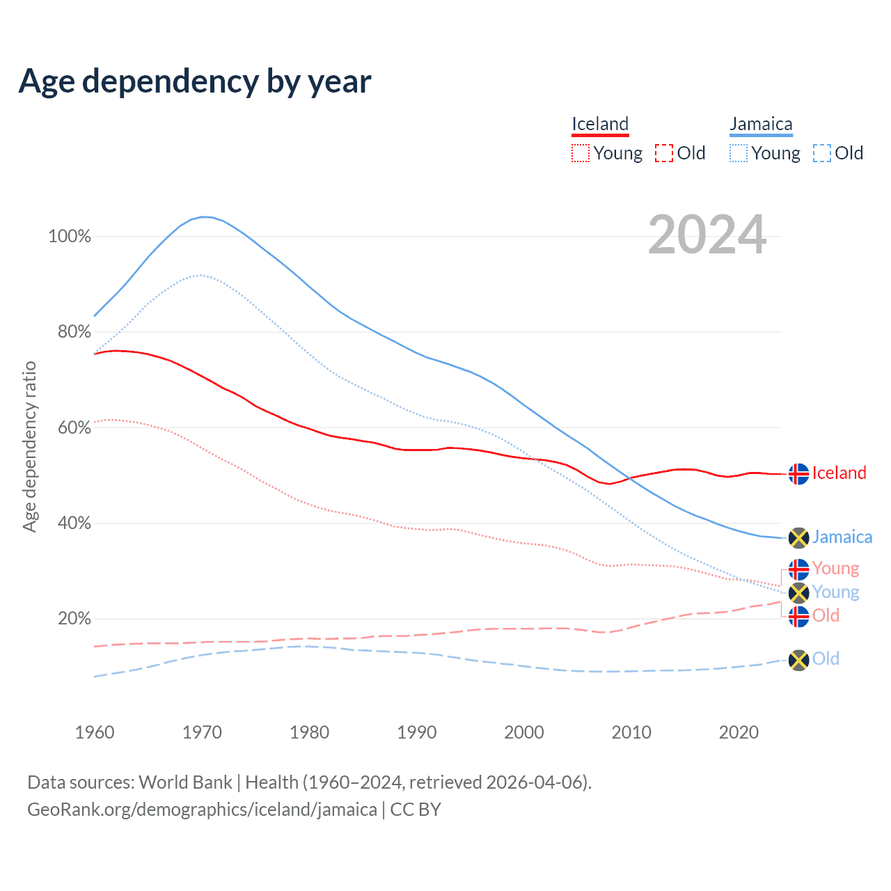 - The share of young demographic (0-15 years old) in Iceland is 17.8% vs 18.7% in Jamaica.
