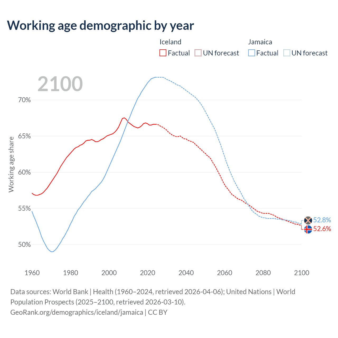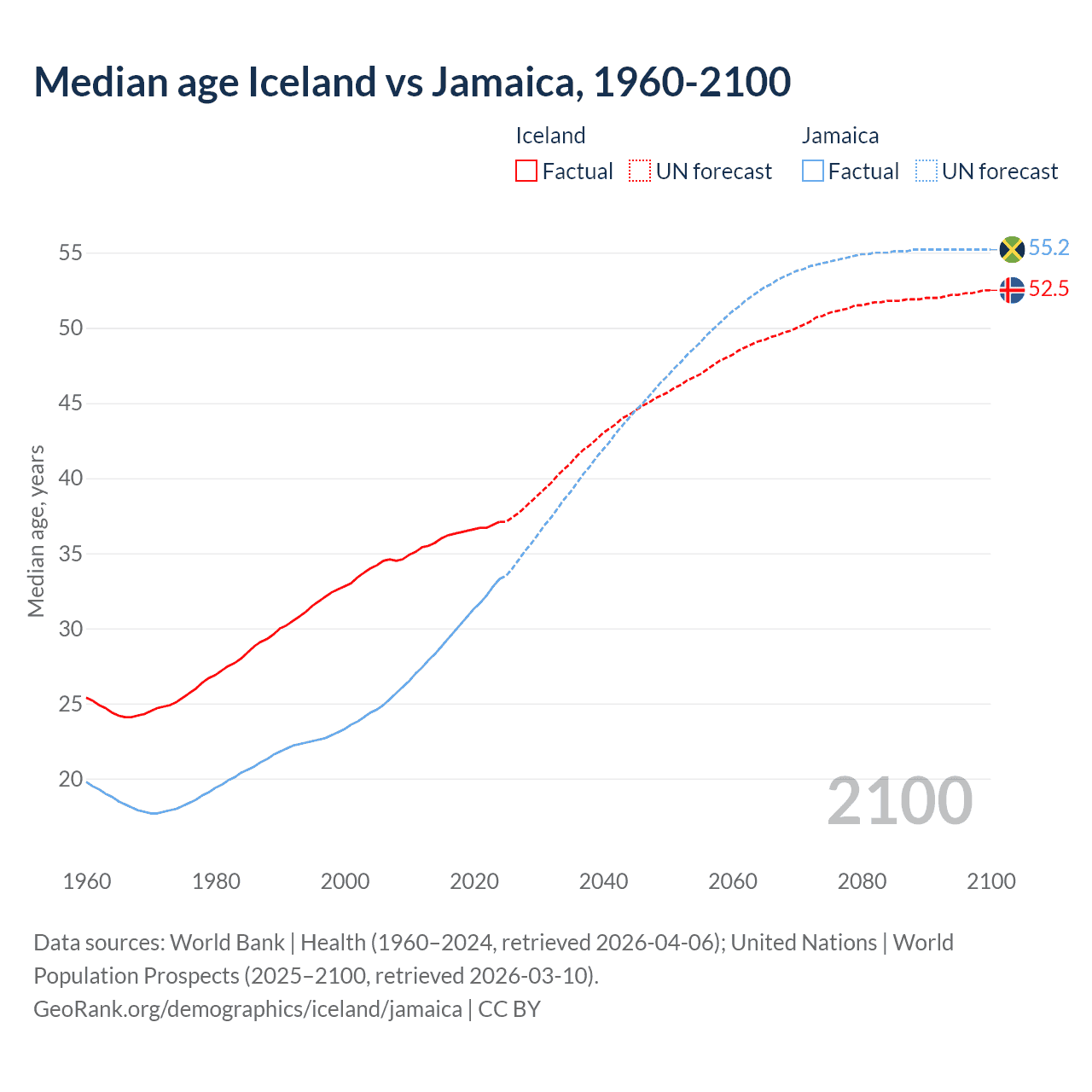 Median age Iceland vs Jamaica, 1960-2100