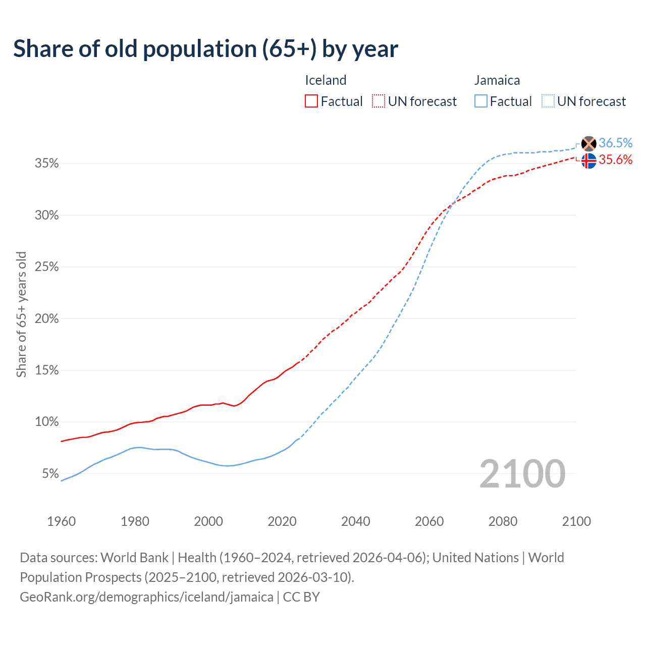 The share of older people aged 65 and over is 15.6% in Iceland and 8.21% in Jamaica. Life expectancy in Iceland compared to Jamaica .