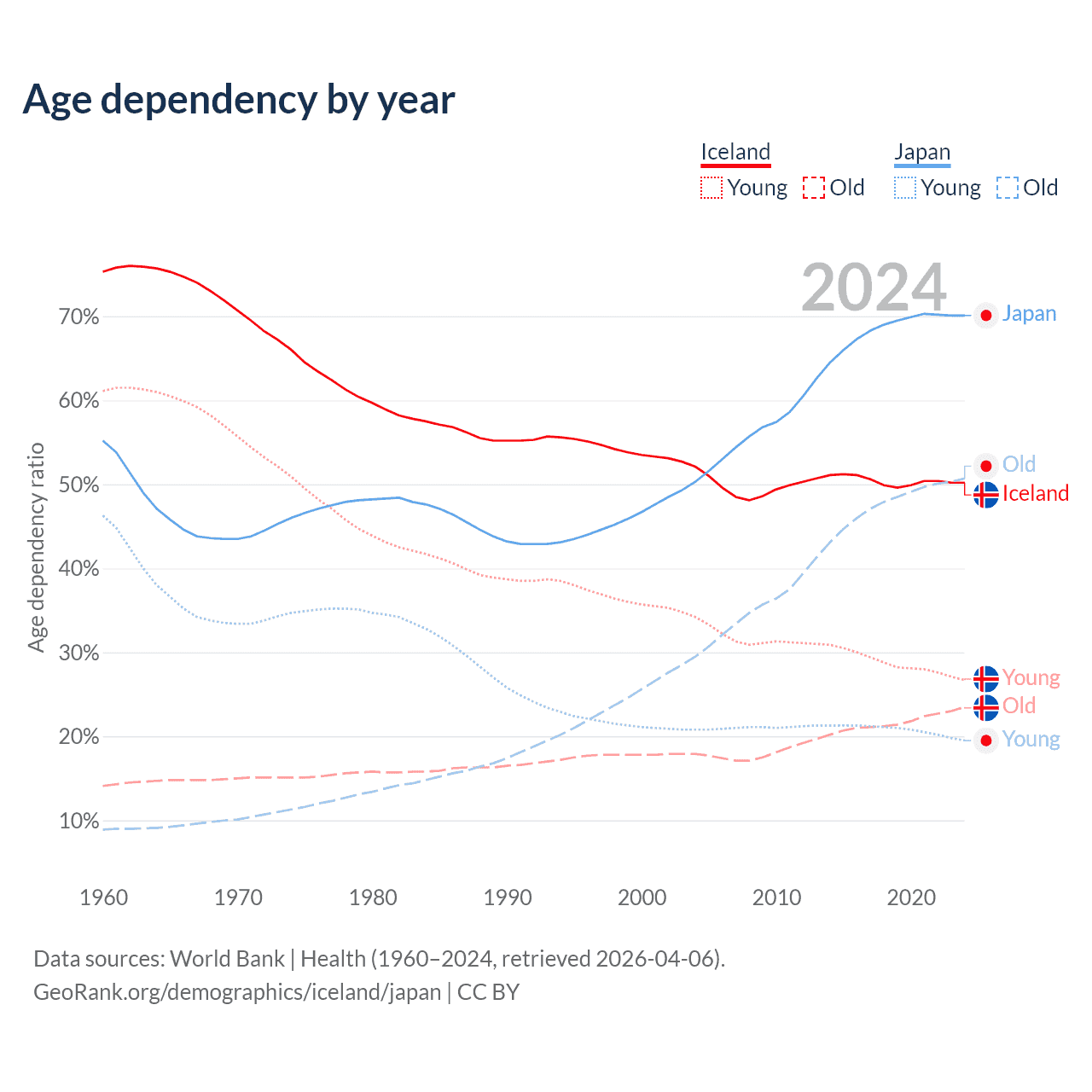 - Iceland is ranked 65/196 by median age (oldest to youngest) vs 2/196 for Japan.