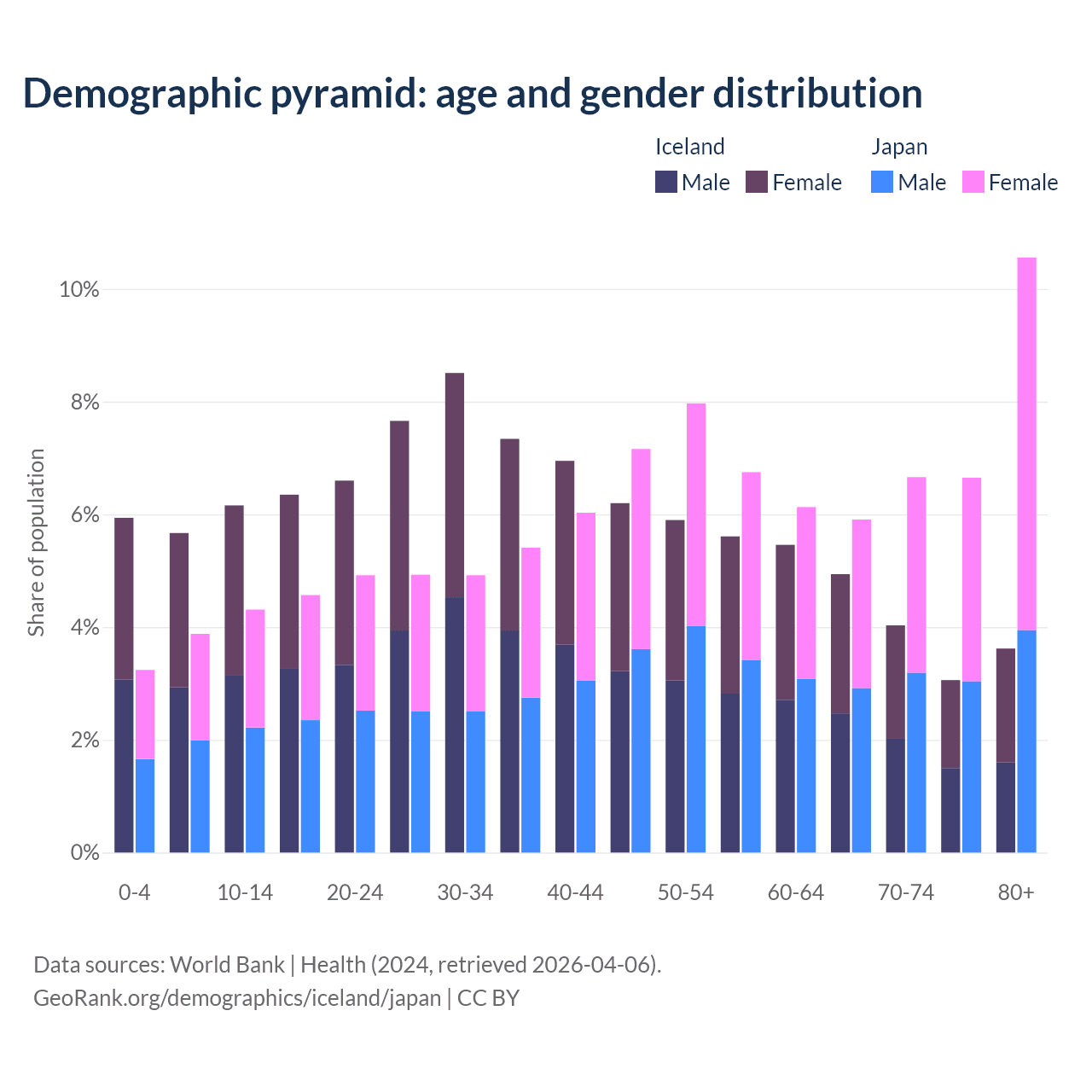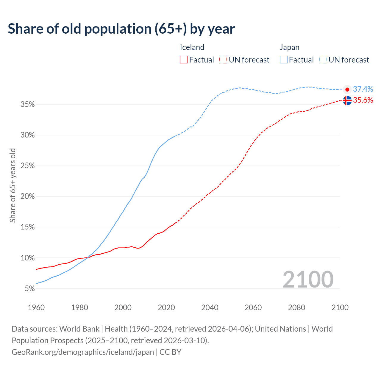 The share of older people aged 65 and over is 15.6% in Iceland and 29.8% in Japan. Life expectancy in Iceland compared to Japan .