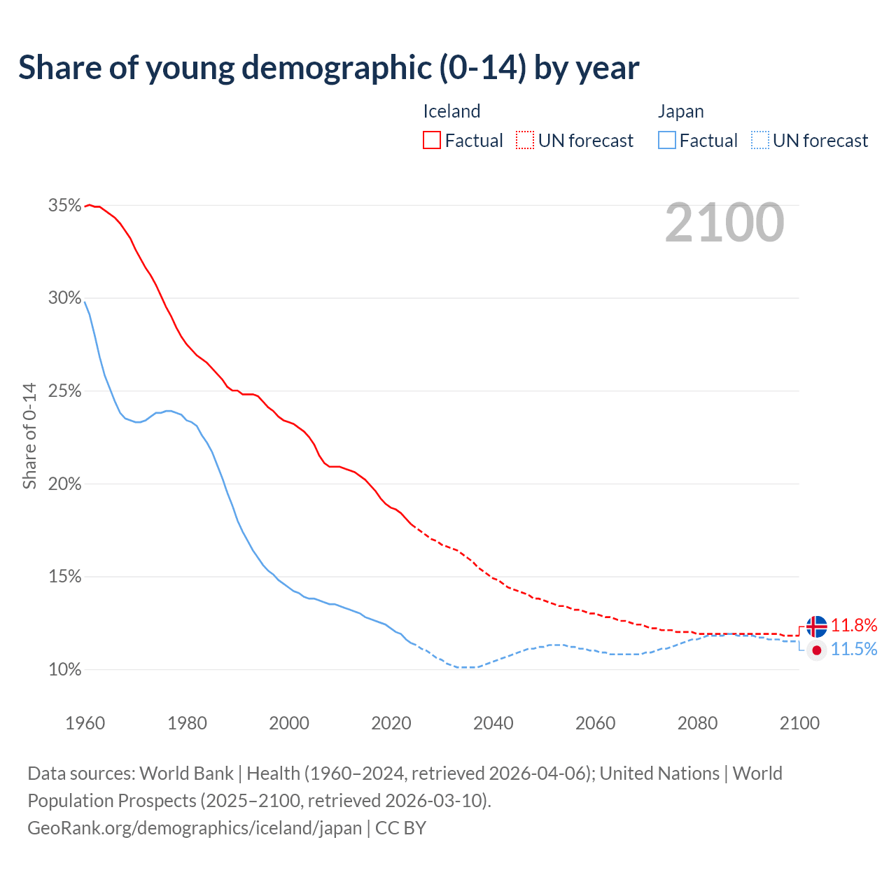 - The share of young demographic (0-15 years old) in Iceland is 17.8% vs 11.4% in Japan.