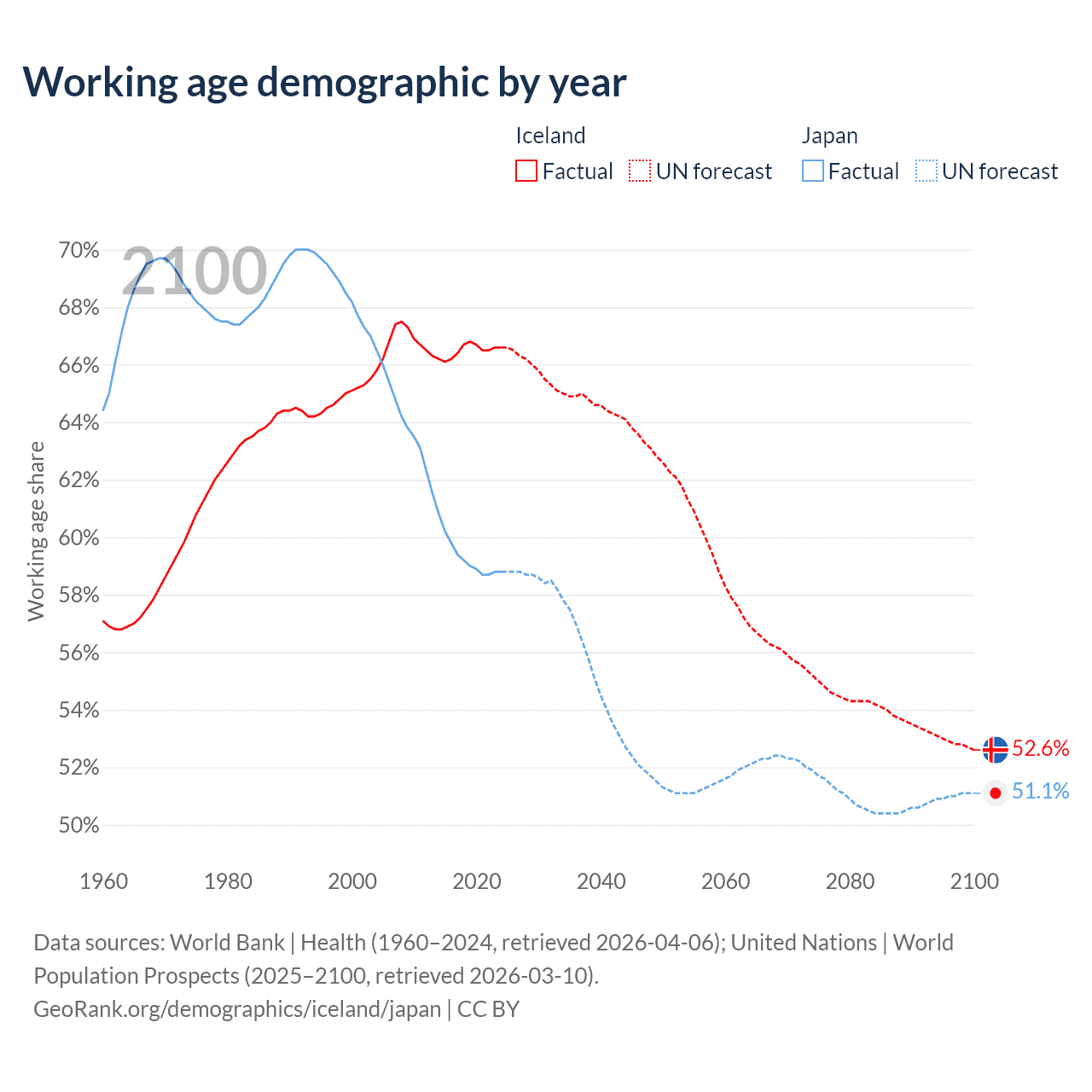 - Iceland has 264K working age adults (aged 15-64) vs 72.1M in Japan.