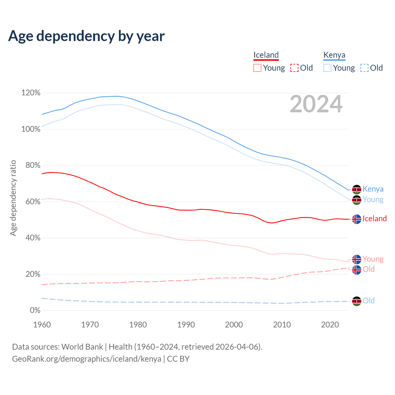 - The share of old-age demographic (65+) in Iceland is 15.6% vs 2.97% in Kenya.