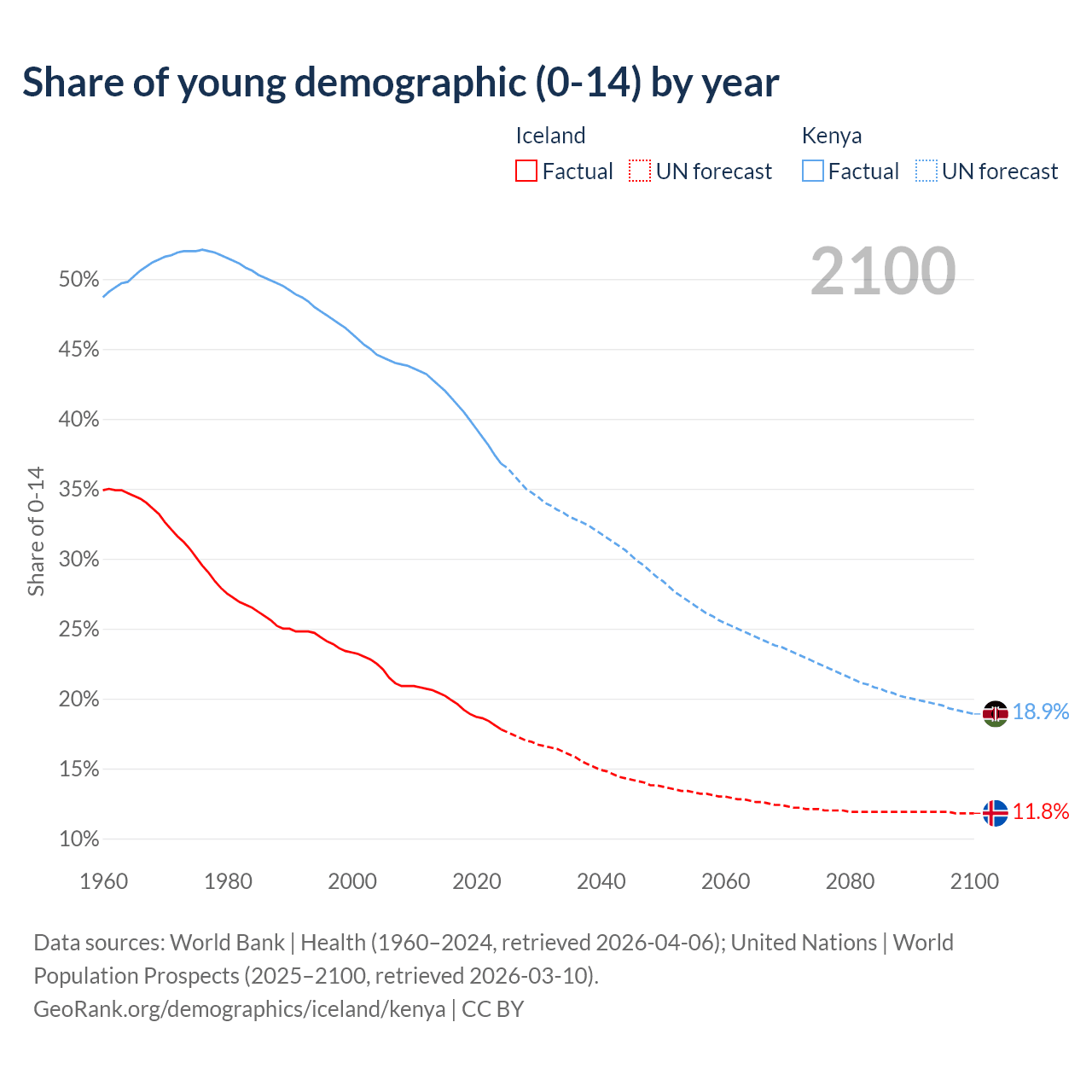 - The share of young demographic (0-15 years old) in Iceland is 17.8% vs 36.8% in Kenya.