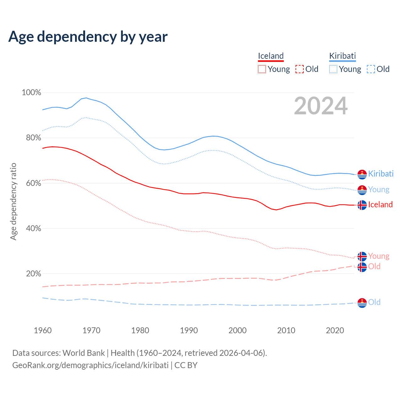 - The share of old-age demographic (65+) in Iceland is 15.6% vs 4.24% in Kiribati.