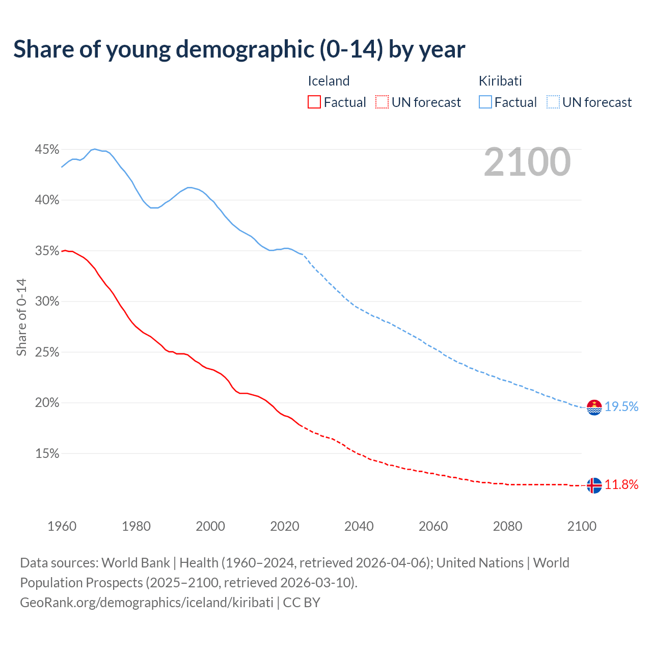 - The share of young demographic (0-15 years old) in Iceland is 17.8% vs 34.7% in Kiribati.