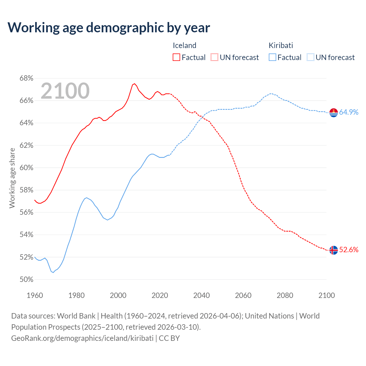 Median age Iceland vs Kiribati, 1960-2100