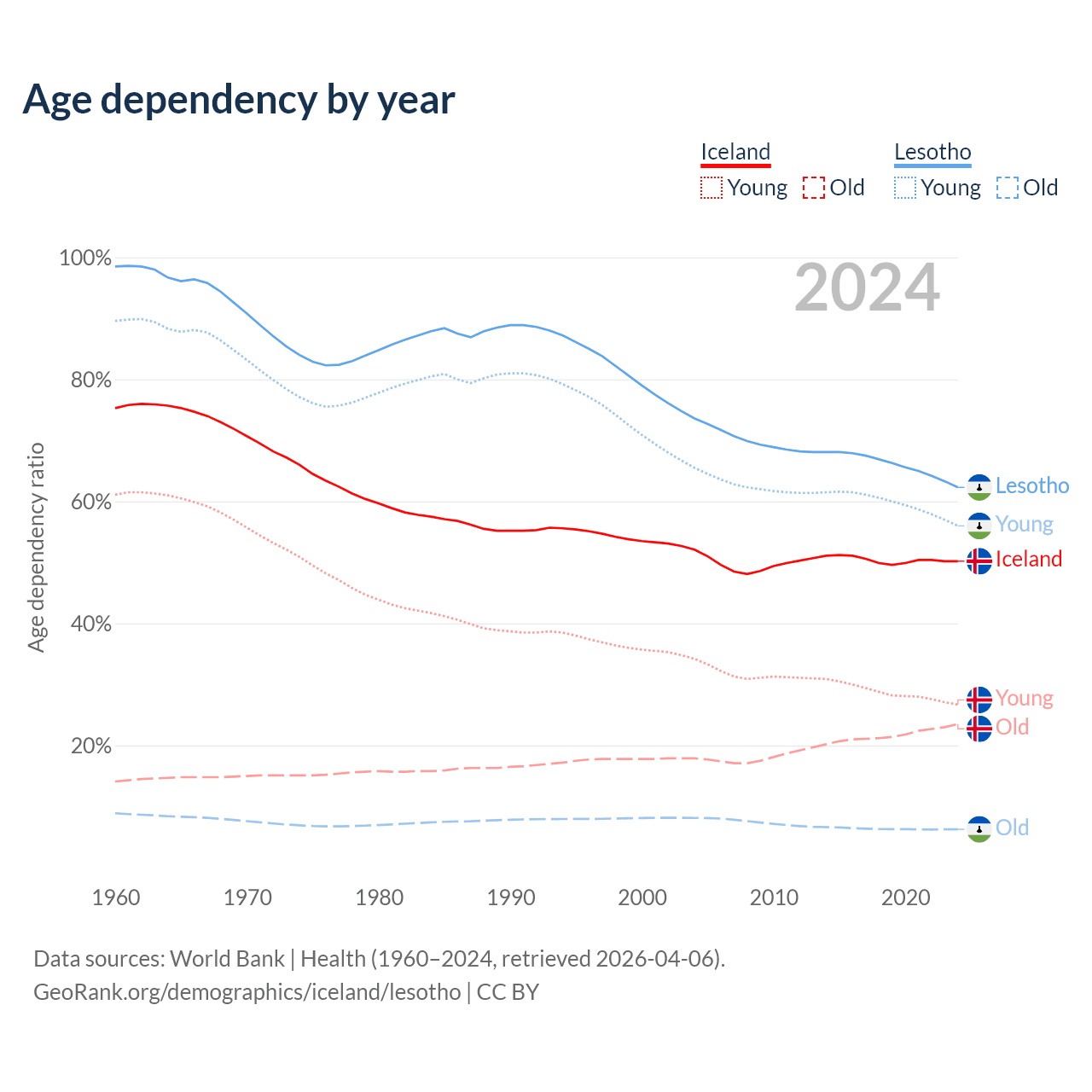 - The share of old-age demographic (65+) in Iceland is 15.6% vs 3.86% in Lesotho.