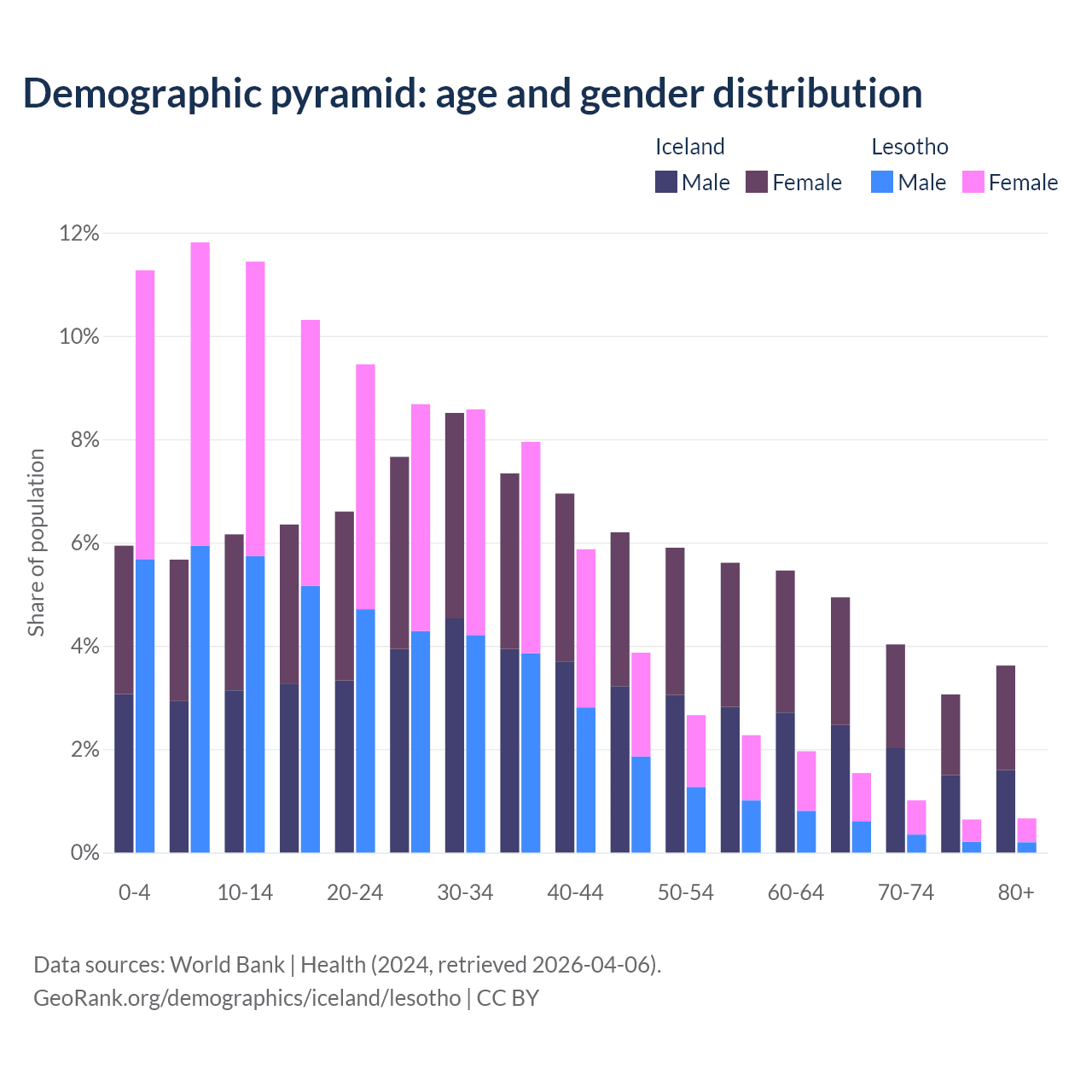 - As of 2026, the population of Iceland is 397K vs 2.4M in Lesotho - 6.03 times difference.
