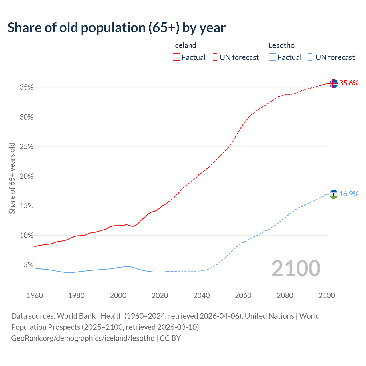 The share of older people aged 65 and over is 15.6% in Iceland and 3.86% in Lesotho. Life expectancy in Iceland compared to Lesotho .