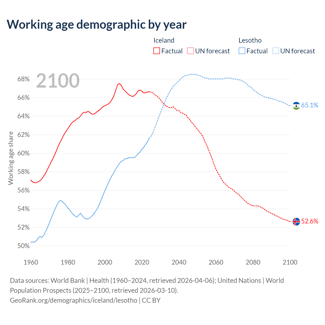 - Iceland has 264K working age adults (aged 15-64) vs 1.48M in Lesotho.