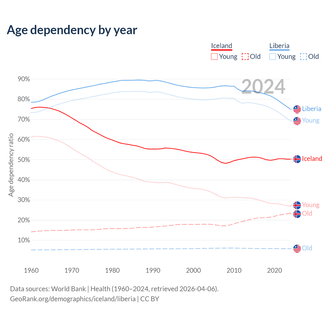 - The share of old-age demographic (65+) in Iceland is 15.6% vs 3.3% in Liberia.