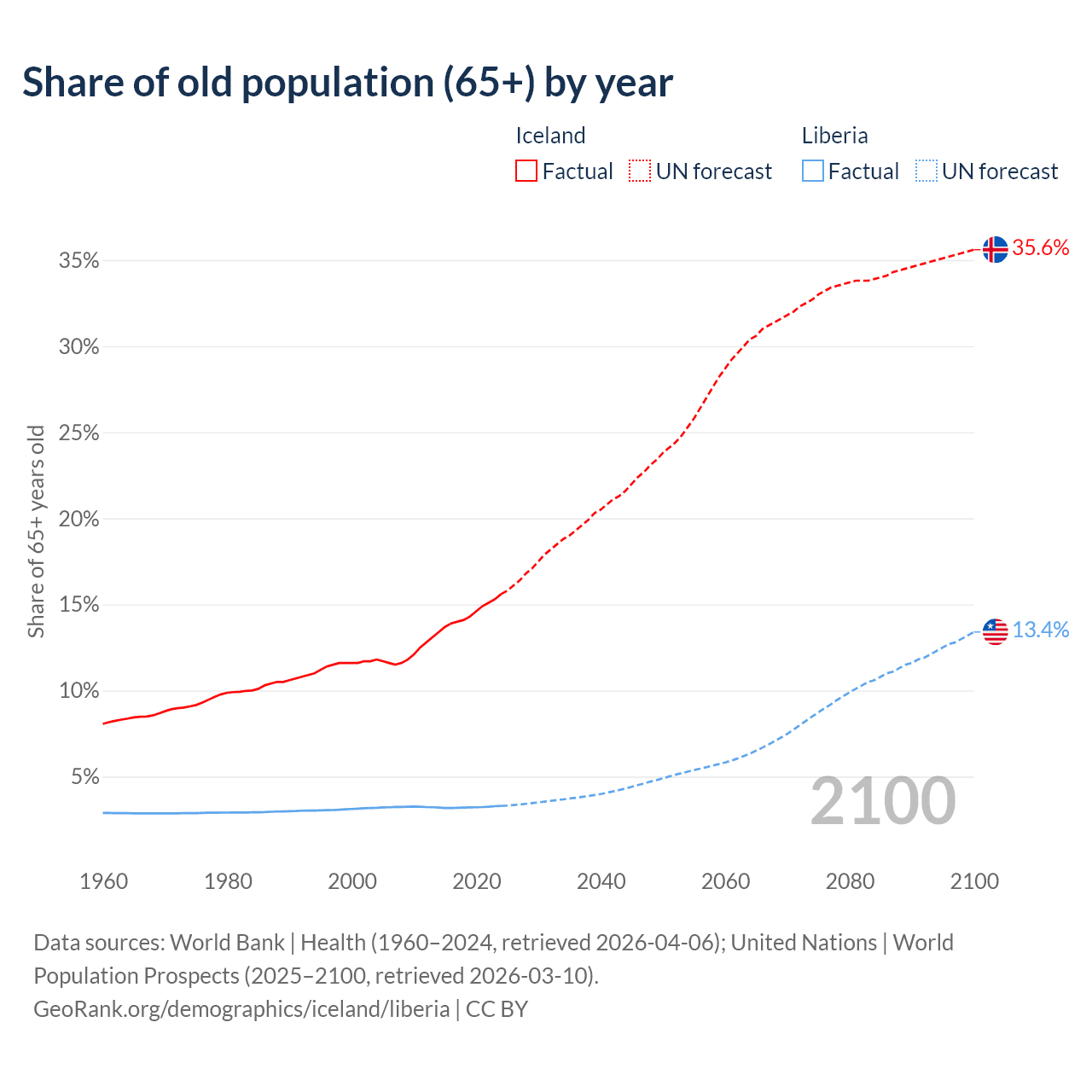 The share of older people aged 65 and over is 15.6% in Iceland and 3.3% in Liberia. Life expectancy in Iceland compared to Liberia .