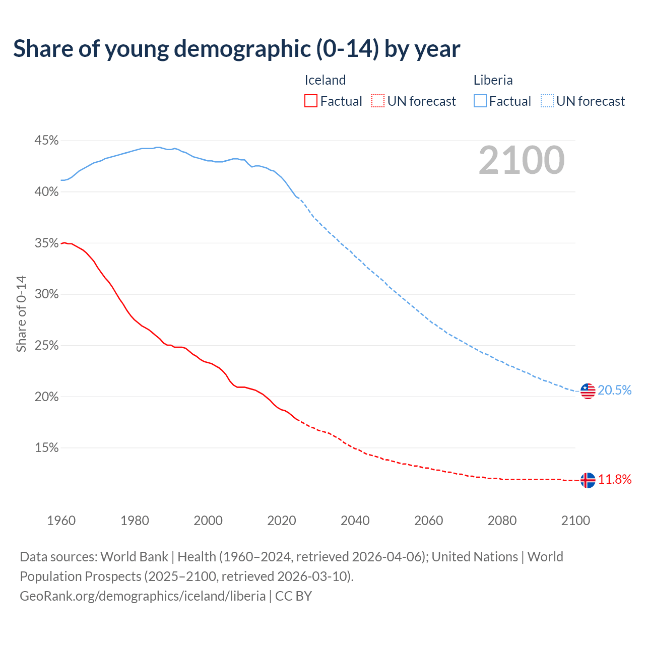 - The share of young demographic (0-15 years old) in Iceland is 17.8% vs 39.5% in Liberia.
