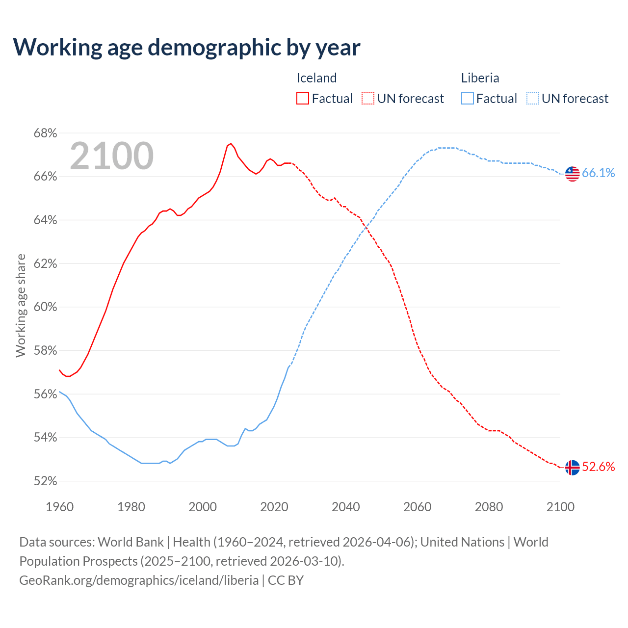 - Iceland has 264K working age adults (aged 15-64) vs 3.37M in Liberia.