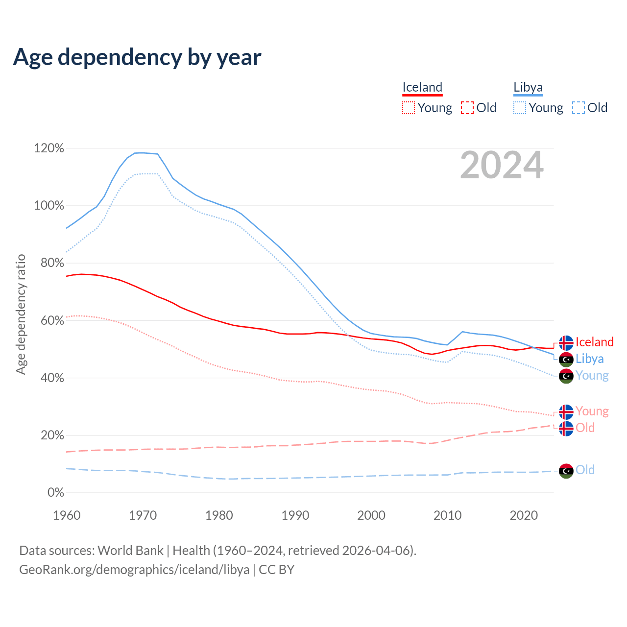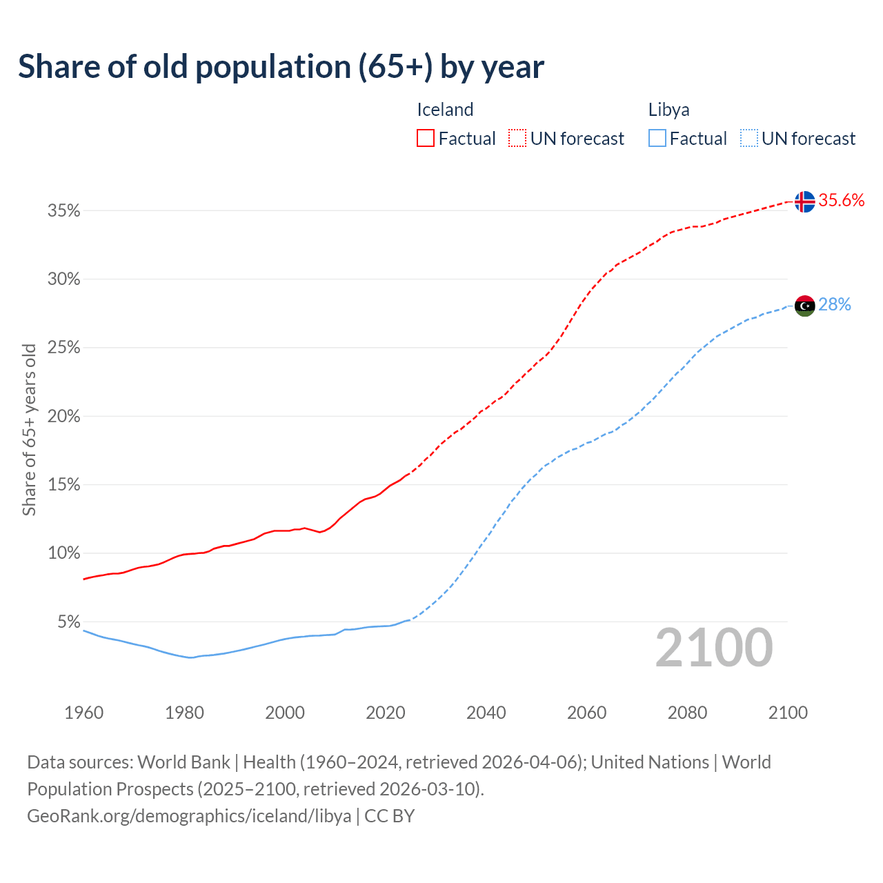 The share of older people aged 65 and over is 15.6% in Iceland and 5.02% in Libya. Life expectancy in Iceland compared to Libya .