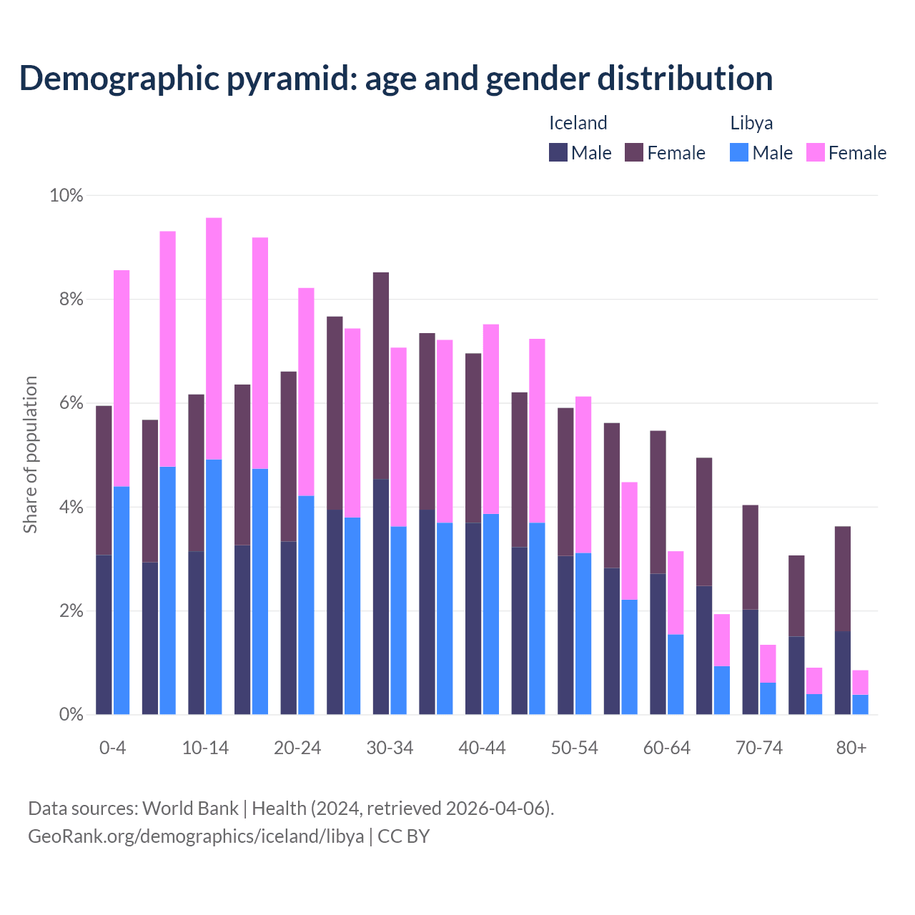 - As of 2026, the population of Iceland is 397K vs 7.56M in Libya - 19 times difference.