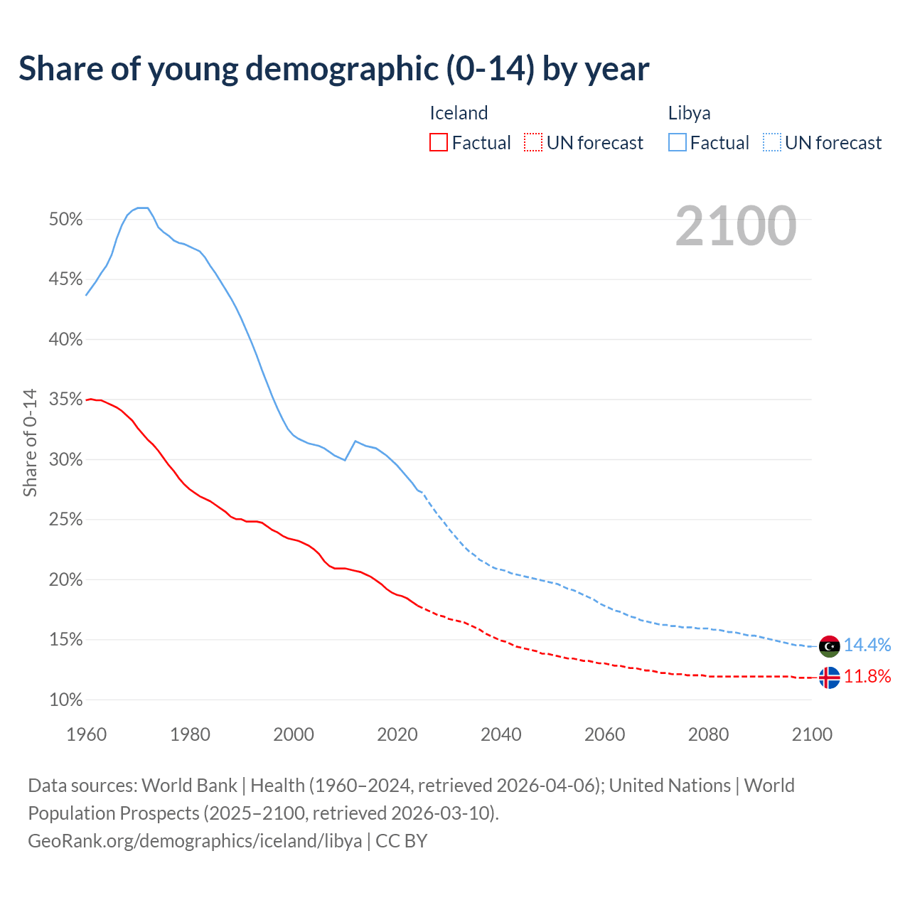 - The share of young demographic (0-15 years old) in Iceland is 17.8% vs 27.4% in Libya.
