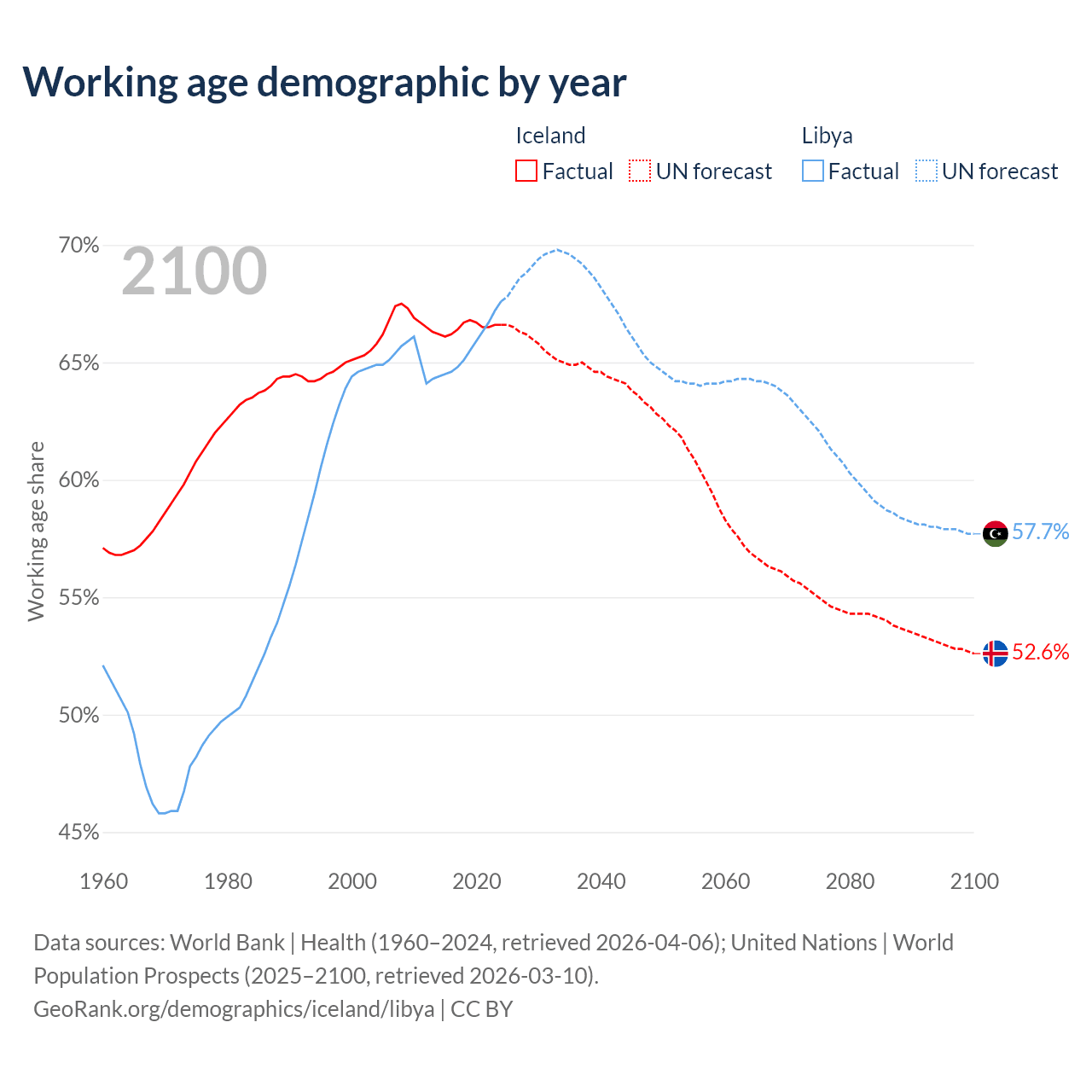 - Iceland has 264K working age adults (aged 15-64) vs 5.11M in Libya.